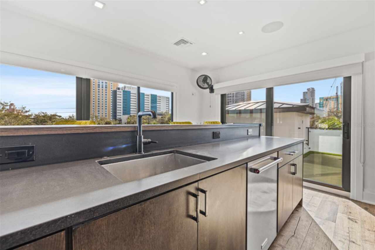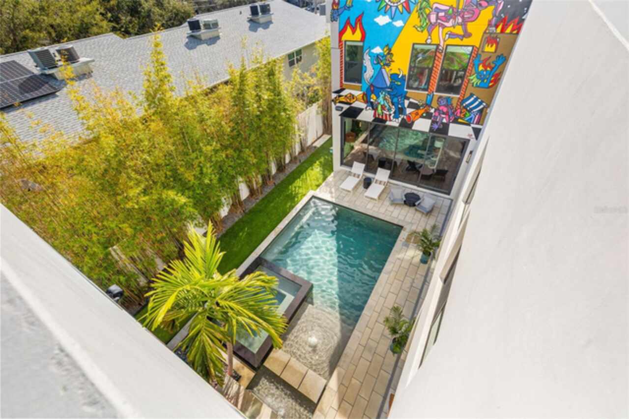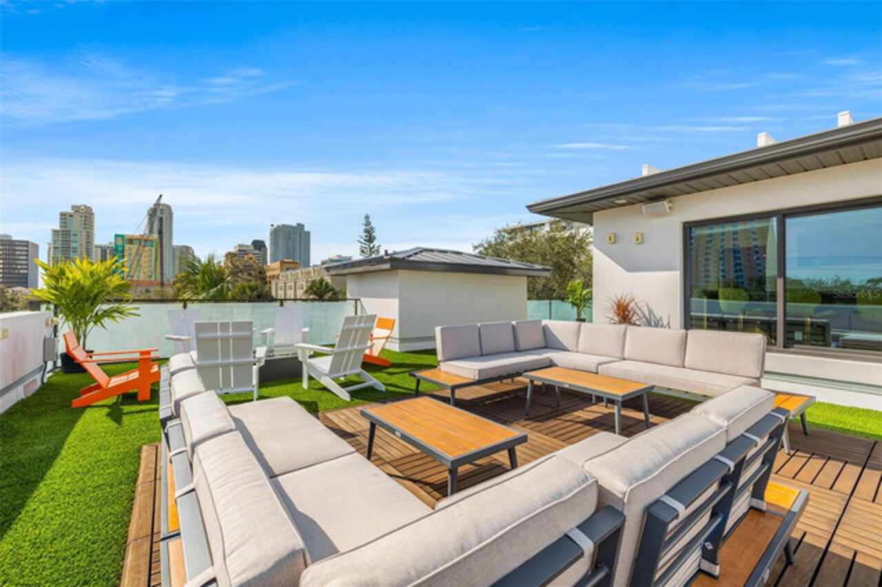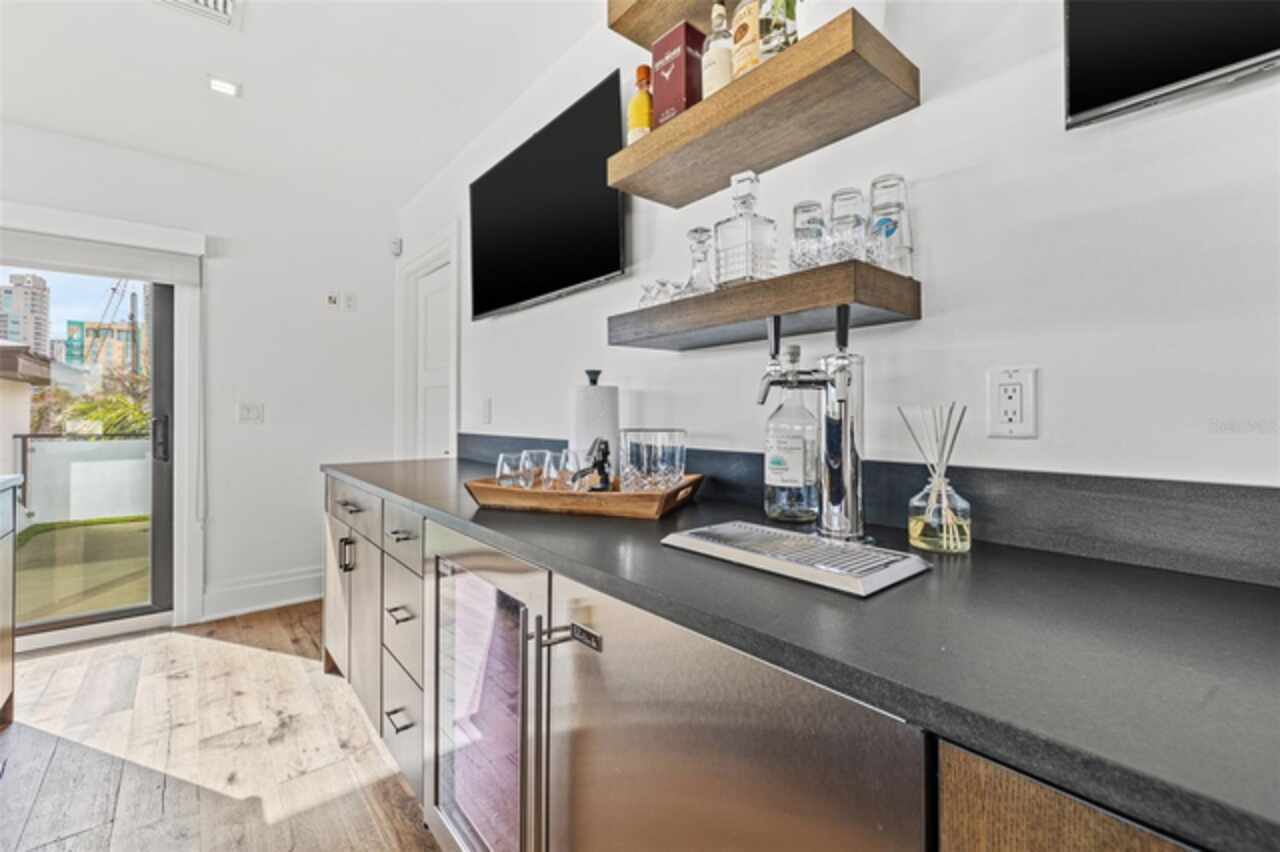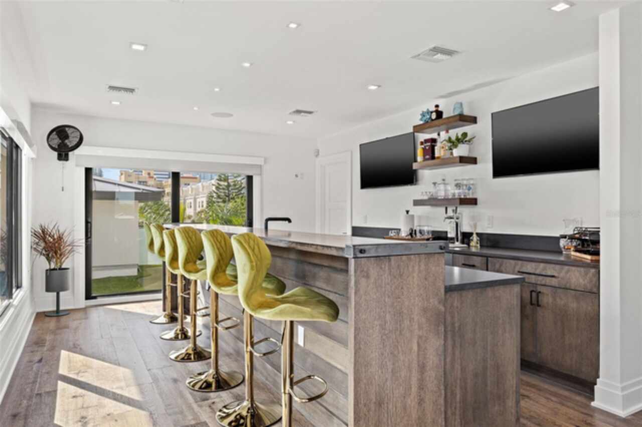 A dazzling masterpiece of engineering and design, this single-family home, completed in 2019, stands as the crown jewel of downtown St. Pete. Both smart and stylish, this spacious home features 6, 617 SqFt of interior magnificence including 5 bedrooms, 7 bathrooms, a 328 bottle wine cellar, office, gym, bonus room & safe room, complemented by an additional 2, 500 SqFt of rooftop terrace, presenting an unparalleled fusion of technology, style, & extravagance. As you step through the oversized, custom Jeld-Wen Aurora front door, a world of sophistication unfolds. The clean & contemporary aesthetic of the hand-scraped wood floors, high ceilings, and exquisite finishes serves as a testament to the meticulous craftsmanship that went into this architectural marvel. The kitchen is a culinary & entertaining paradise, featuring an ensemble of top-tier Sub Zero and Wolf appliances & an expansive island that serves as a beautiful focal point. The culinary arsenal includes a Wolf 6-burner gas range, oven, steamer/cooker & warming drawer, and a Sub Zero refrigerator/freezer that elevates storage to an art form. Delight in the convenience of Sub Zero refrigerator drawers discreetly tucked into the kitchen island, ensuring freshness at your fingertips. Porcelain Calcutta countertops & floor-to-ceiling soft-close cabinets, adorned with under-cabinet lighting, exude a modern elegance that seamlessly integrates form and function. The retractable sliding floor-to-ceiling glass wall merges indoor & outdoor spaces, opening to a utopian oasis featuring a saltwater pool and spa, outdoor dining area, and putting greens. Head on up to the rooftop terrace, a sublime sanctuary, that hosts a fire pit, putting green, indoor wet bar & spacious seating area, making it an enchanting spot to hang out and savor panoramic views of the cityscape. The whole house is a tech enthusiast's dream, where cutting-edge innovation integrates into the fabric of daily living. The home is powered by a CONTROL4 full house automation system, orchestrating audio, TVs, select lighting, front door camera/doorbell, and security cameras at the touch of your fingertips. Three CONTROL4 touchscreens & remote access ensure effortless control over every facet of this smart ecosystem. The perimeter is guarded by 12 exterior Hikvision HD dome cameras & 1 garage camera, all feeding into a 4TB camera system hard drive for seamless playback and storage. Immerse yourself in an immersive auditory experience, with 7.1 surround sound in the great room & 5.1 surround sound in the bonus room, both powered by Yamaha receivers. Connectivity is king with 21 hard-wired Cat 6 media outlets, professionally installed TV mount & 7 prewired media outlets strategically placed for potential future TVs. This home also boasts a package network system, including a cloud-managed power distribution unit, Gigabit VPN router, wireless controller, 2 24-port Gigabit switches & 6 WiFi access points throughout the house for a robust and reliable signal. A dedicated entertainment rack and center in the downstairs office closet ensure that all audio-visual elements are seamlessly wired. Ready for any eventuality, the home is generator-ready with both natural gas and electric hookups outside, offering peace of mind in the face of unforeseen circumstances. This home is the next era of living, where the fusion of state-of-the-art smart home technologies meets the elegance of design and style in perfect harmony.