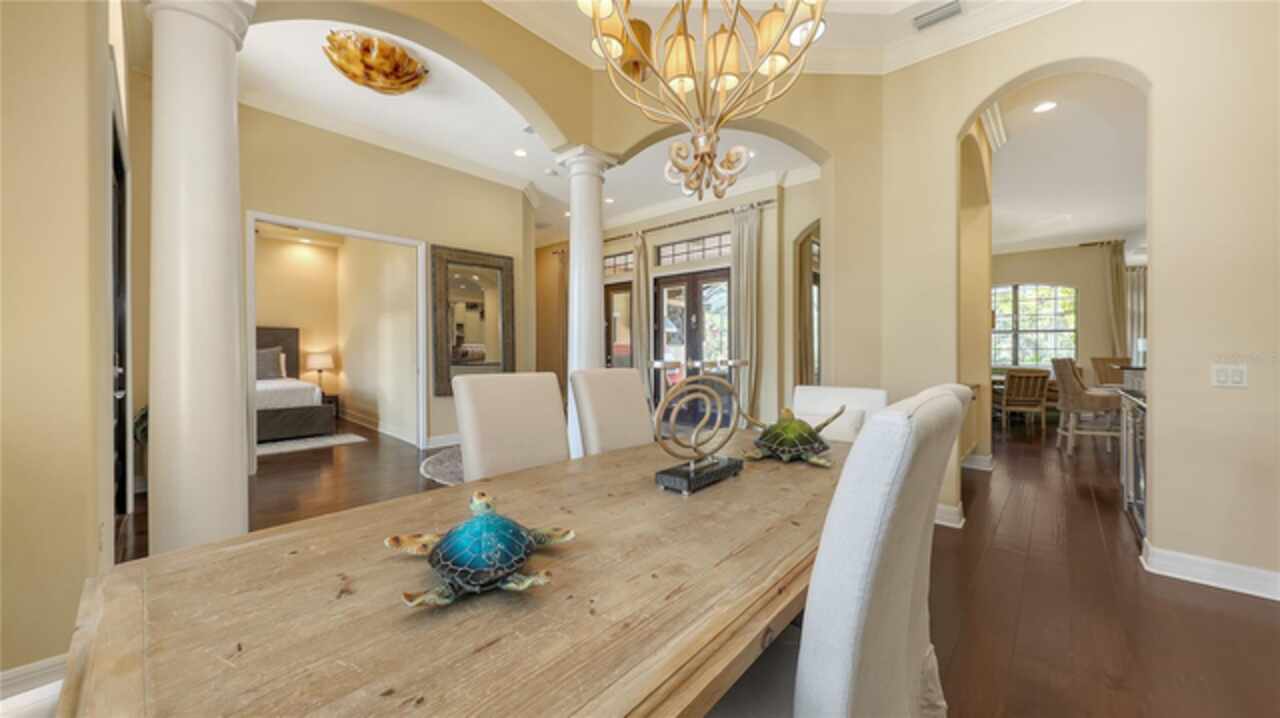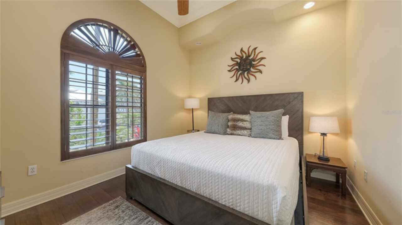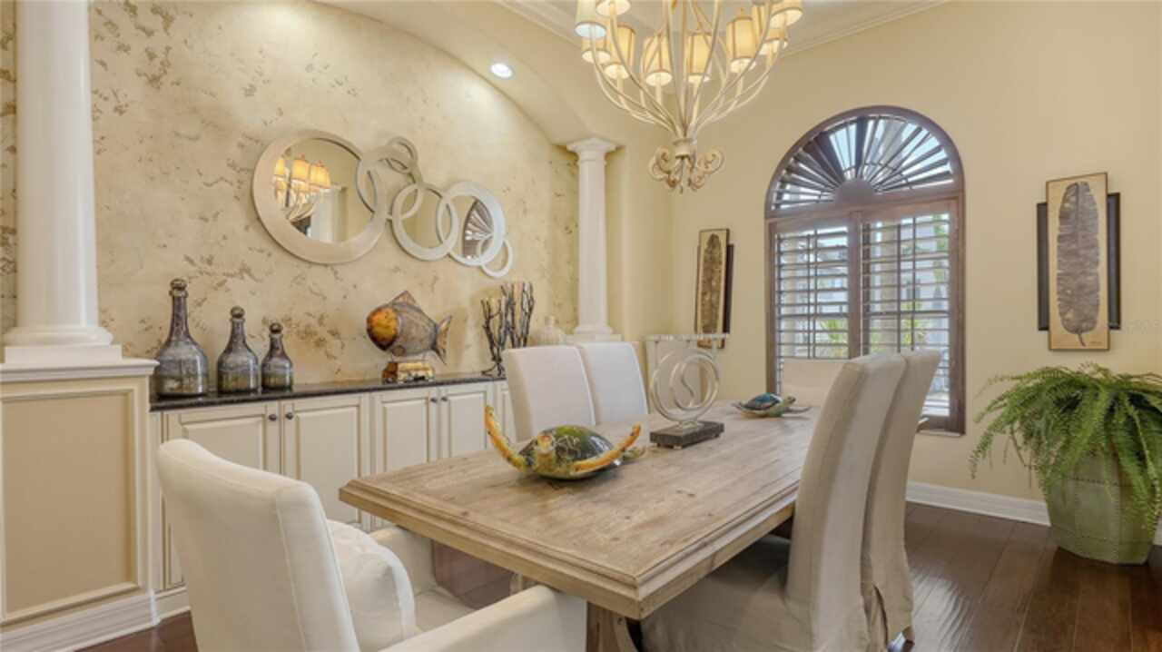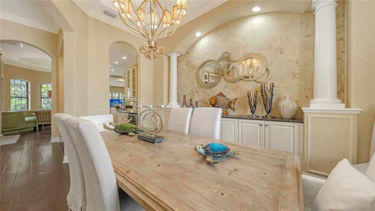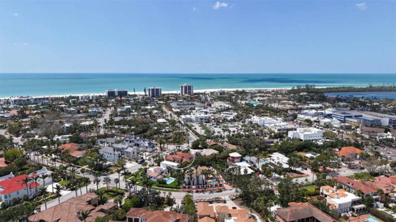 Positioned just one block from the lively pulse of St. Armands Circle and minutes from Lido Beach, this turnkey-furnished home offers a refined coastal lifestyle in Sarasota’s most coveted island community. Built in 2007 by the Peregrine Group, this elevated residence spans over 4, 000 square feet across two levels, combining timeless architecture with modern comforts. A pavered circular drive and lush tropical landscaping create an impressive entrance, leading to a spacious three-car garage. Step through double doors into a grand foyer that opens to a light-filled interior adorned with 12-foot ceilings, wood flooring, crown molding, and thoughtful details throughout. Oversized windows and French doors frame views of the serene outdoors, inviting natural light into every corner of the home. The open-concept floorplan was designed with entertaining in mind. A chef’s kitchen anchors the main living space, complete with high-end stainless-steel appliances, wraparound breakfast bar, granite-topped island, casual dinette, and a well-appointed bar with wine refrigerator. The adjoining formal dining area is perfect for special gatherings, while the expansive living room provides a seamless connection between indoor and outdoor living. Step through French doors to your private outdoor oasis, where a screen-enclosed, south-facing lanai awaits. A covered summer kitchen with gas grill, fireplace, and seating area invites outside dining and relaxing poolside afternoons. The heated saltwater pool features a sunshelf, cascading waterfalls, and a raised spa. The main level primary suite is a tranquil haven with direct patio access, custom walk-in closet, and en-suite bathroom offering dual vanities, soaking tub, and walk-in shower. A private den, currently used as a fifth bedroom, and a spacious laundry room complete the first floor. Upstairs, three generously sized guest suites—each with private baths—provide privacy and flexibility for family and overnight guests. Two suites include access to sunny upper balconies. Beyond the lush grounds of this serene property lies the best of Sarasota living. Explore the world-class restaurants, charming cafés, and stylish boutiques of St. Armands Circle, just steps from your door. Bike to the shores of Lido Beach or venture a little farther to Longboat Key. Enjoy proximity to downtown Sarasota’s vibrant arts scene, theaters, and marina, completing the picture of an unmatched coastal lifestyle. This is more than a home—it’s a destination.