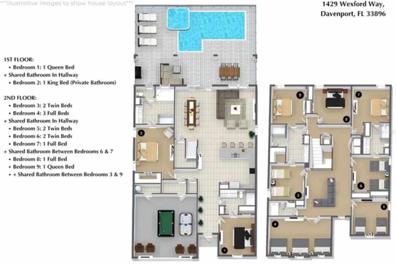Under contract-accepting backup offers. Reduced Price!! Welcome to this stunning fully furnished and beautifully decorated 9-bedroom, 5-bathroom vacation home in the sought-after Champions Gate Resort! Designed for comfort and entertainment, this home features an open floor plan, stainless steel appliances, and two bedrooms conveniently located on the first floor (one with a private en-suite). Upstairs you’ll find seven additional bedrooms—some with fun themed décor—and a second living room/TV area perfect for family movie nights. Step outside to enjoy your own private heated pool and spacious patio, ideal for relaxing after a day at the parks. Located in a gated community, this home offers access to world-class amenities. At The Oasis Club, residents and guests enjoy a huge resort-style pool, lazy river, two-story waterslide, splash zone, arcade, movie theater, fitness center, tennis & sand volleyball courts, plus on-site dining including a Tiki Bar, Grill Room Restaurant, and a convenient sundries shop. For even more fun, The Retreat Club features mini golf, water slides, splash pad, poolside loungers, and a resort pool. Golf enthusiasts will also love the ChampionsGate Country Club Golf Course nearby. This property is perfectly situated close to Orlando’s top attractions: just 9.6 miles to Disney, 12.9 miles to the Convention Center, 17.5 miles to SeaWorld, 21.3 miles to Universal Studios, and 26.6 miles to Legoland. Whether for personal use or as a high-demand short-term rental investment, this property offers the ultimate resort lifestyle in the heart of Central Florida!