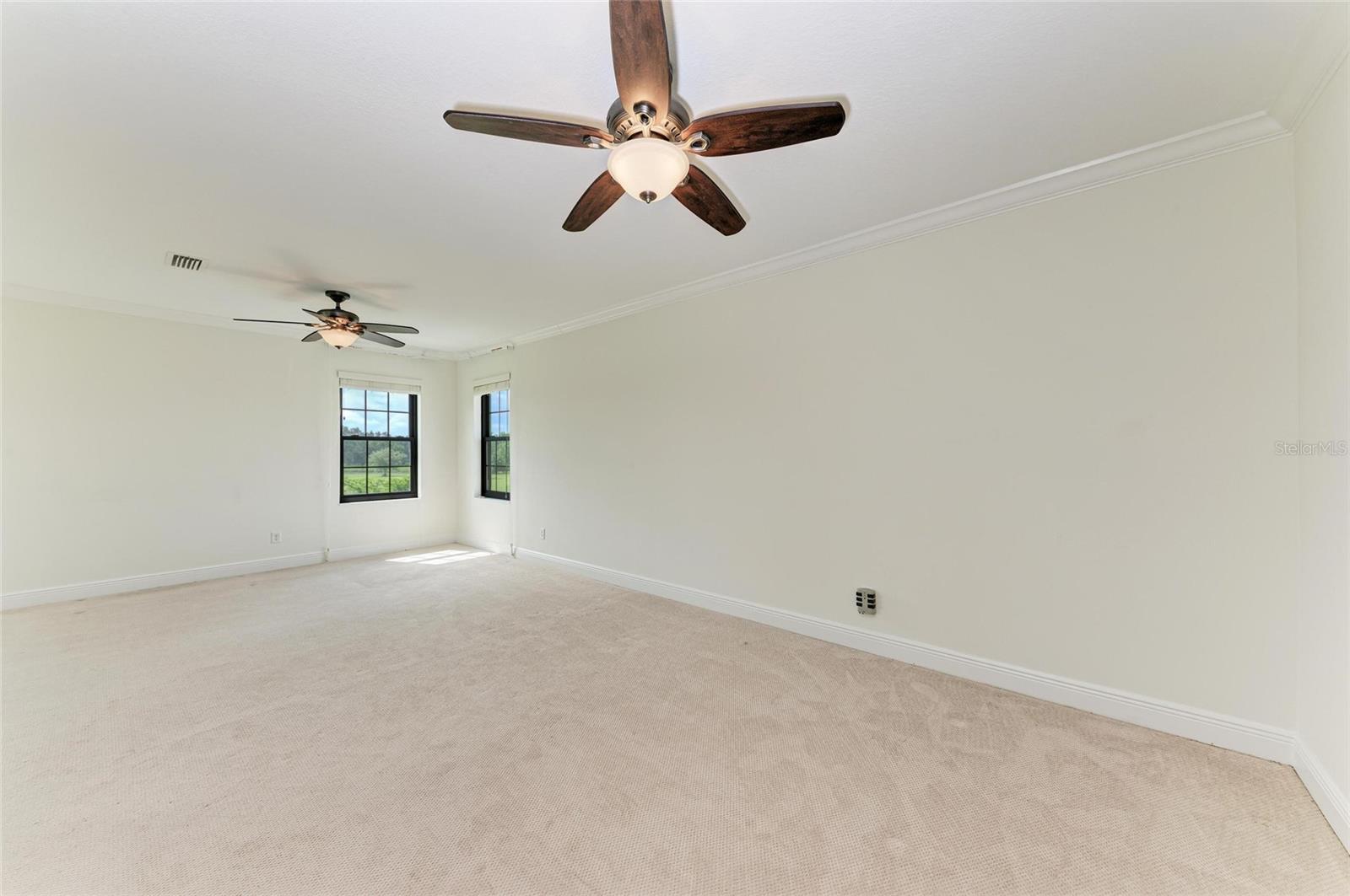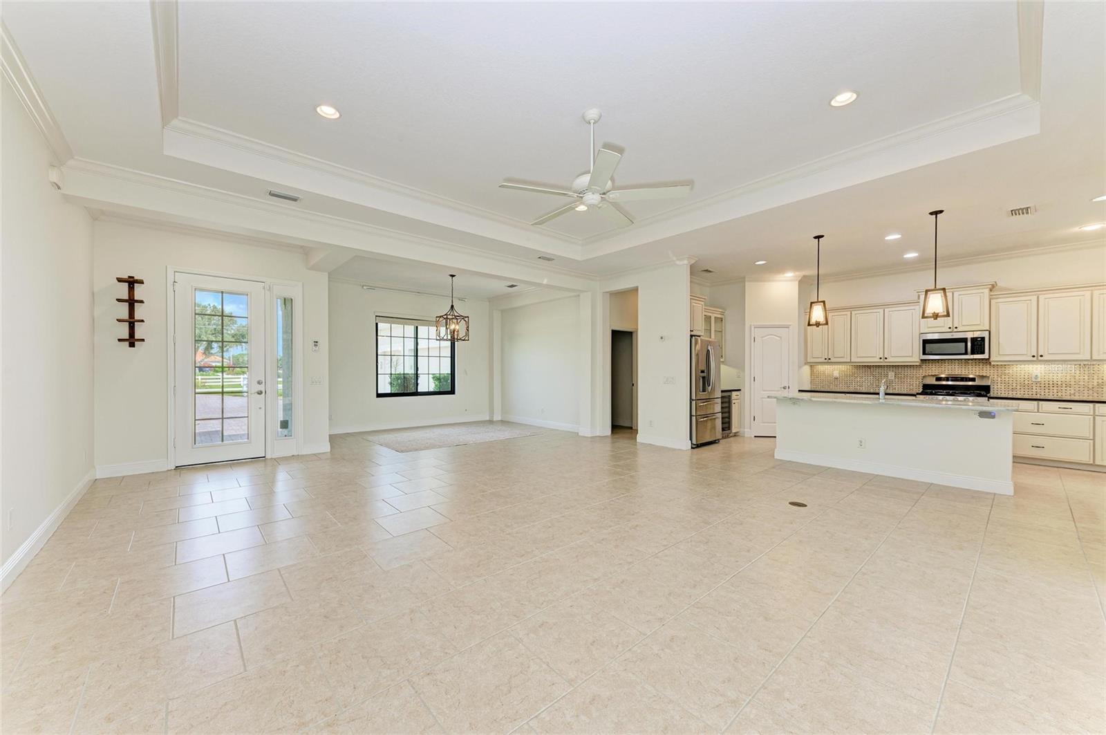 Ceiling Fans(s), Crown Molding, Eat-in Kitchen, High Ceilings, Kitchen/Family Room Combo, Open Floorplan, Primary Bedroom Main Floor, Solid Surface Counters, Split Bedroom, Stone Counters, Thermostat, Tray Ceiling(s), Walk-In Closet(s)