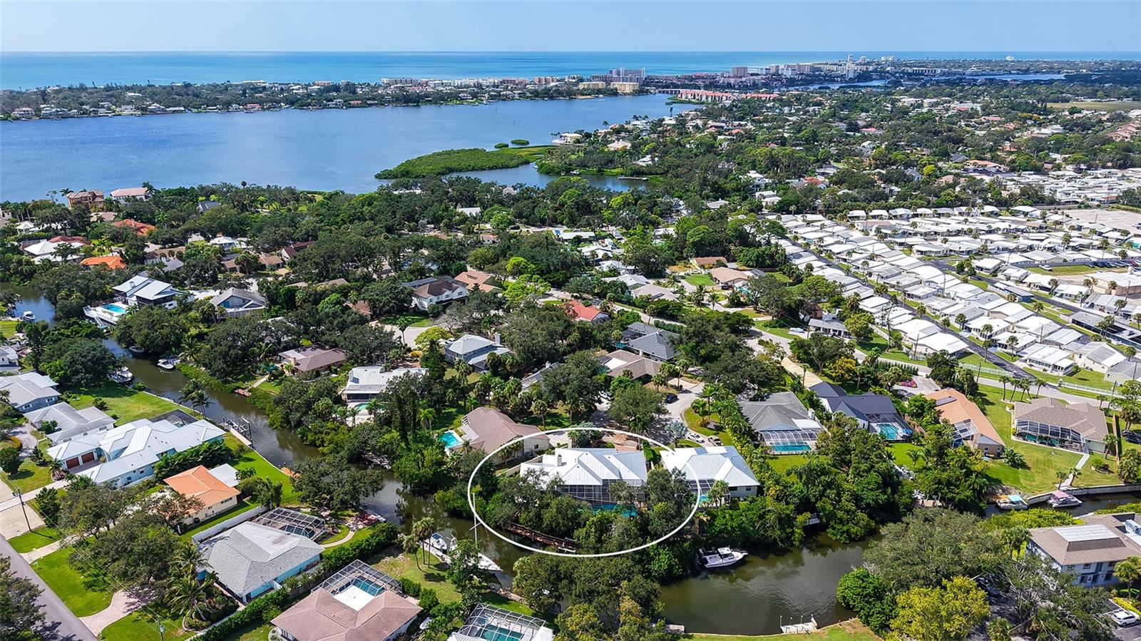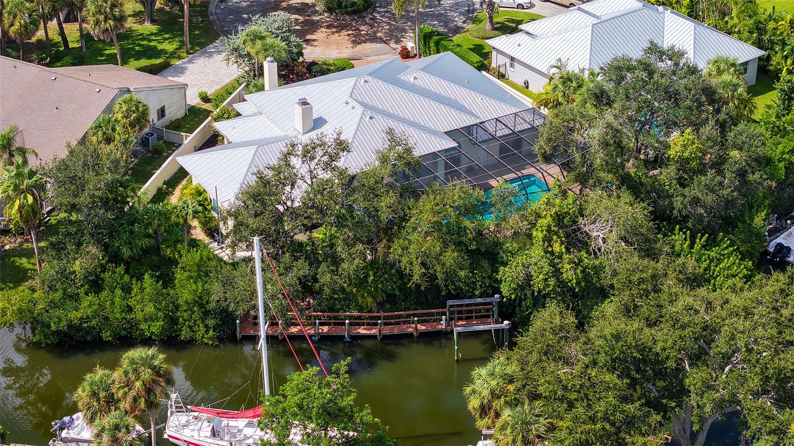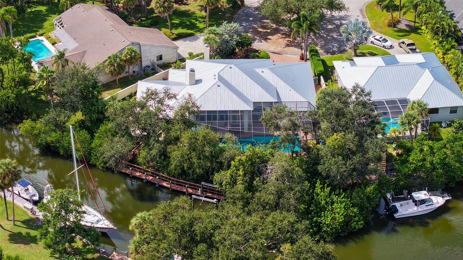 Waterfront Luxury Living at its Finest! Enjoy direct boat access to Gulf through Midnight Pass with no bridges to navigate under. This stunning canal-front estate offers the perfect blend of elegance, comfort, and functionality, all just minutes from Siesta Key and the best of Sarasota living. A private iron gate and paver driveway lead to a secluded courtyard, setting the tone for the luxurious living that awaits inside. Upon entering through etched glass double doors, you're greeted by soaring tray ceilings, custom architectural details, and a spacious open floor plan designed for both everyday relaxation and seamless entertainment. The great room is anchored by a striking European-style carved wood fireplace with a wine-making motif, creating a cozy focal point. Adjacent to the living area, the gourmet kitchen is a chef’s dream, featuring solid wood cabinetry, a copper sink, and a large granite bar with seating for six, plus an induction cooktop and separate oven. A butler’s pantry and an eat-in area overlooking the pool add convenience and charm. For more formal occasions, the dining room provides a view of the private courtyard. Designed with privacy in mind, the home boasts a split-floor plan, including a spacious owner’s suite with a newly renovated spa-inspired bathroom, complete with a custom tile walk-in shower, soaking tub, dual sinks with granite countertops, and built-in cabinetry. The walk-in closet offers custom organization, and the suite has direct access to the pool area through sliding glass doors. The second bedroom is handicap accessible with its own ensuite bathroom and pool access, while the third bedroom, currently used as a den, offers a Murphy bed and its own ensuite bathroom. The expansive living space extends outdoors through French doors leading to the oversized pool and spa, surrounded by lush tropical landscaping and offering stunning water views. A boater’s paradise, the private 65’ dock has room for two vessels with one in the 13, 000 lb. lift and space for another boat or yacht along the dock, complete with shore power, freshwater, and night lighting. The canal has direct access to the Intracoastal Waterway. Additional features include tile and engineered hardwood floors, a large two-car garage with built-in storage, updated AC units, a new metal roof (2023), dual tankless water heaters, and modern pool equipment. This property is fully equipped with outdoor electrical, irrigation, and a dog run with fencing, ensuring comfort and convenience for all. Located in a coveted West of Trail neighborhood, this home offers unparalleled proximity to Siesta Key, Gulf Gate dining and shopping, and downtown Sarasota and Venice. This home sits on high ground and has never sustained any storm damage or flooding. This one-of-a-kind property truly offers the best of waterfront living—don’t miss the opportunity to make it yours!