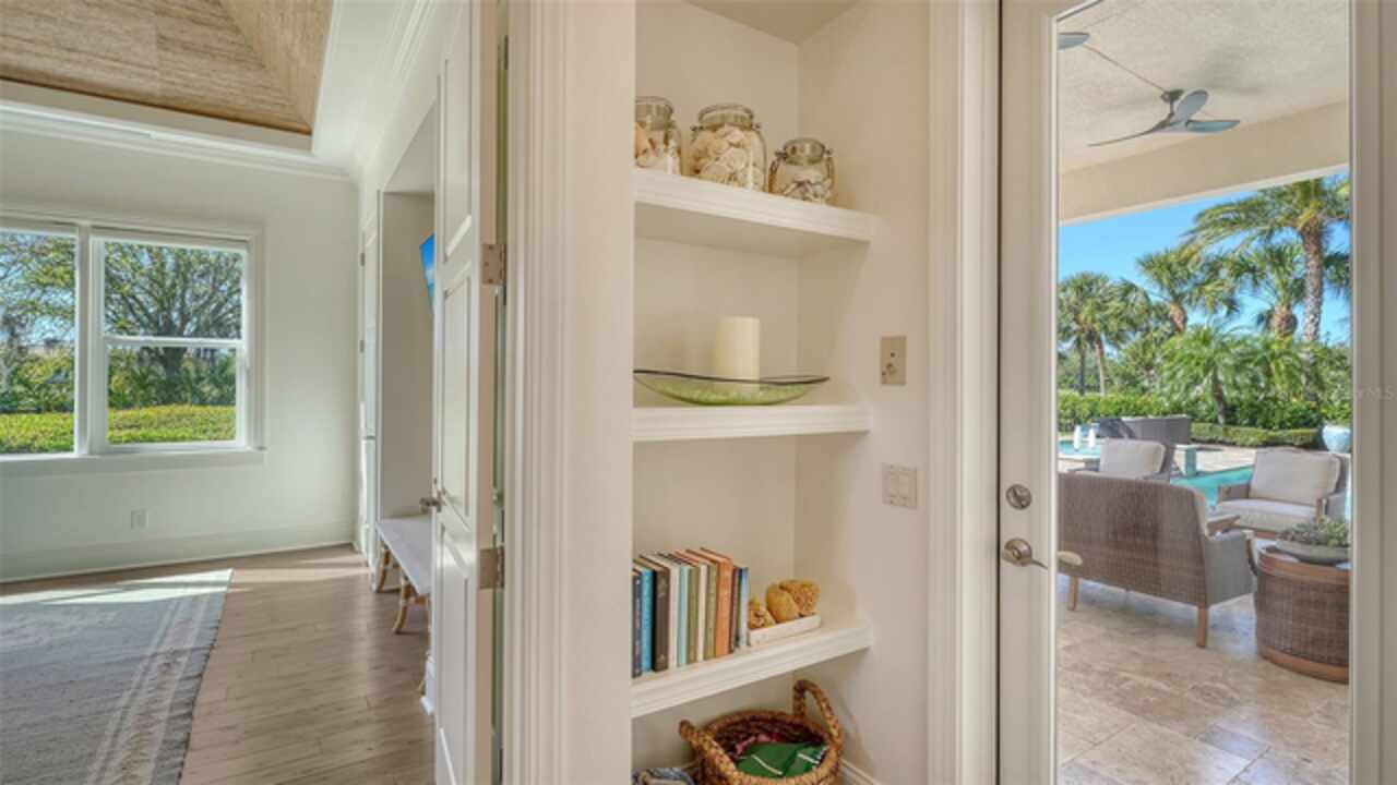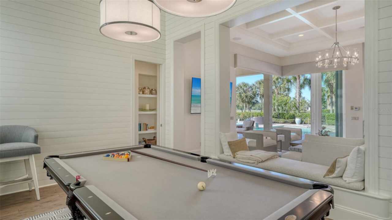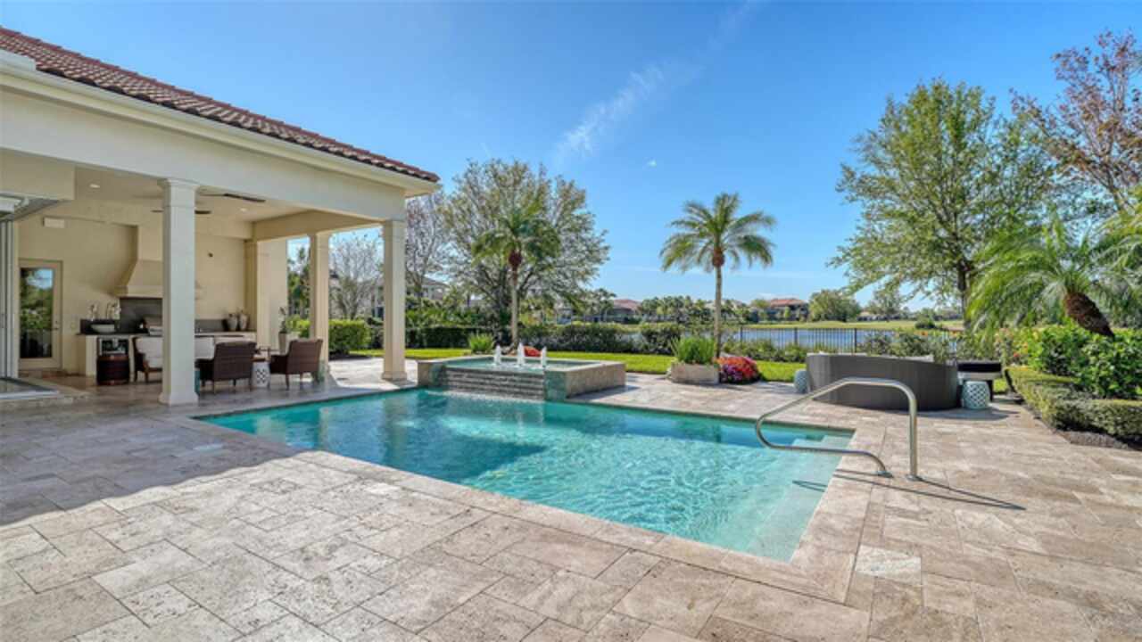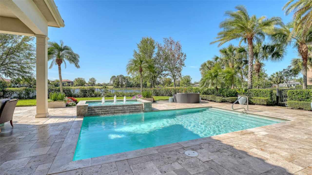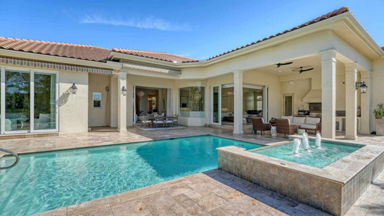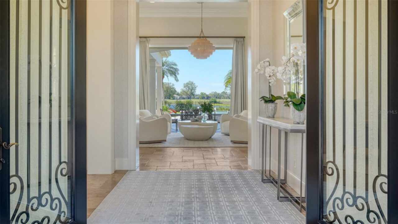 Timeless elegance meets modern luxury in this stunning 4-bedroom, 4.5-bath CERTIFIED FLORIDA GREEN custom home, situated on a private, fenced lot of over half an acre in the prestigious “Estates” section of Sarasota’s finest, The Founders Club. The Founders Club is an award-winning private member-owned golf club community offering 24 hour guarded gate access, just 262 homes nestled along 700 acres of lakes, fairways, and nature preserves. Originally a London Bay showcase model, the owners have transformed the residence into a stunning serene, spa-inspired retreat with one of Sarasota’s top designers, Angela Rodriguez Interiors. Upon entering the grand iron glass double doors, you are immediately captivated by the magnificent setting of the property and its breathtaking views looking out to the pool, pond, preserve and the club’s famous Robert Trent Jones Jr golf course. A dramatic courtyard entry, enhanced by refreshed landscaping and ambient lighting, leads you in through the intricate architectural elements including coffered ceilings, elegant crown moldings, 8-inch baseboards, Phillip Jeffries wall coverings, Serena and Lily décor accents, and chiseled travertine flooring that extends seamlessly to the outdoor living areas through 10-foot disappearing corner sliders. A chef’s kitchen, complete with Cambria quartz countertops, a Calacatta Gold backsplash, cabinet-front Monogram appliances, remote-controlled shades, and a built-in banquette with a custom-crafted wood table (that does convey with the home) flows effortlessly into the great family room. A dedicated dining room and versatile bonus/billiard room add character and function, while the private office supports today’s lifestyle needs. The serene owner’s suite occupies its own private wing. This luxurious space includes a cozy sitting area, expansive walk-in closet, freestanding soaking tub, oversized rain shower, double quartz vanity with makeup station, and refined designer finishes. Outdoors enjoy a true resort-style sanctuary with two covered lanais, an open-air pool, a raised spa with fountains, and a fully equipped outdoor kitchen. Retractable awnings extend shade over the veranda for relaxed dining and entertaining. Throughout the home, fresh paint, statement walls, tongue-and-groove ceilings, and mercury glass details add texture and polish. Additional features include 3 new HVAC systems installed this year, motorized blinds and plantation shutters throughout, hurricane impact windows and sliders, an oversized 3-car motor court garage with temp-controlled storage space. Every inch of this home has been thoughtfully designed to impress not only beauty but peace of mind and energy efficiency, as this home offers a suite of smart and energy-efficient upgrades: a new whole-house gas water heater, Control4 smart lighting and sound, a Halo water purification system, a full-house Generac generator, hurricane impact windows and sliders helping earn its status as a Florida Green Certified Home issued by the Florida Green Building Coalition. Residents of The Founders Club enjoy access to tennis courts, a sports court, playground, and community center. This extraordinary residence exudes refined sophistication, all within a short drive to Sarasota International Airport, shopping, dining and Sarasota’s rich art’s culture such as the Ringling Museum, Marie Selby Gardens, Van Wezel Performing Art Hall, Sarasota Orchestra, Asolo Theater.