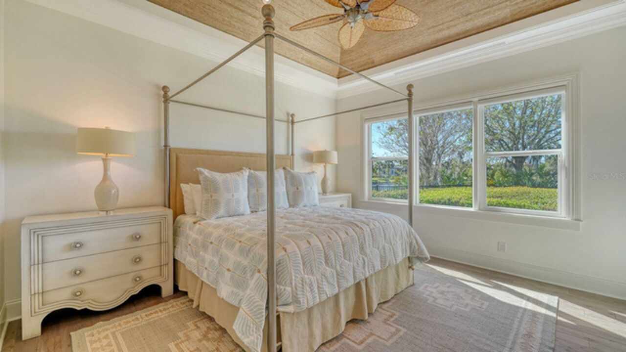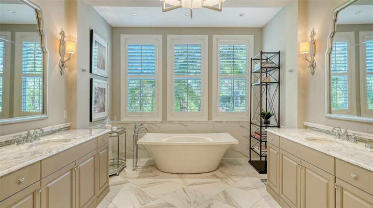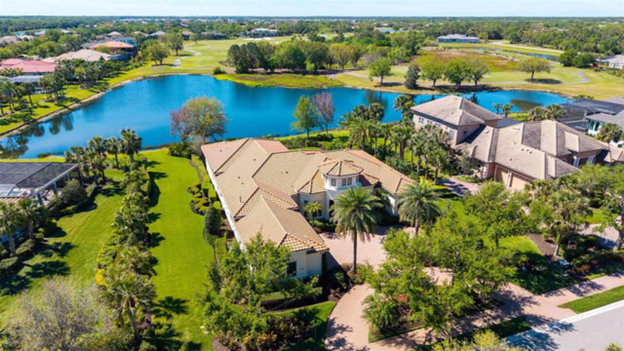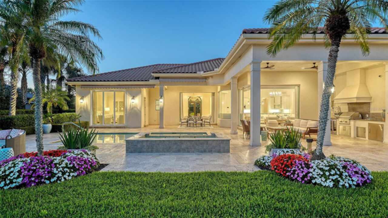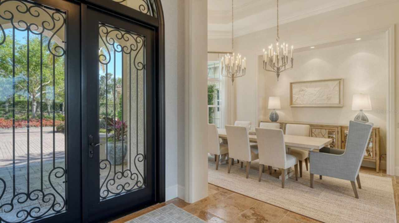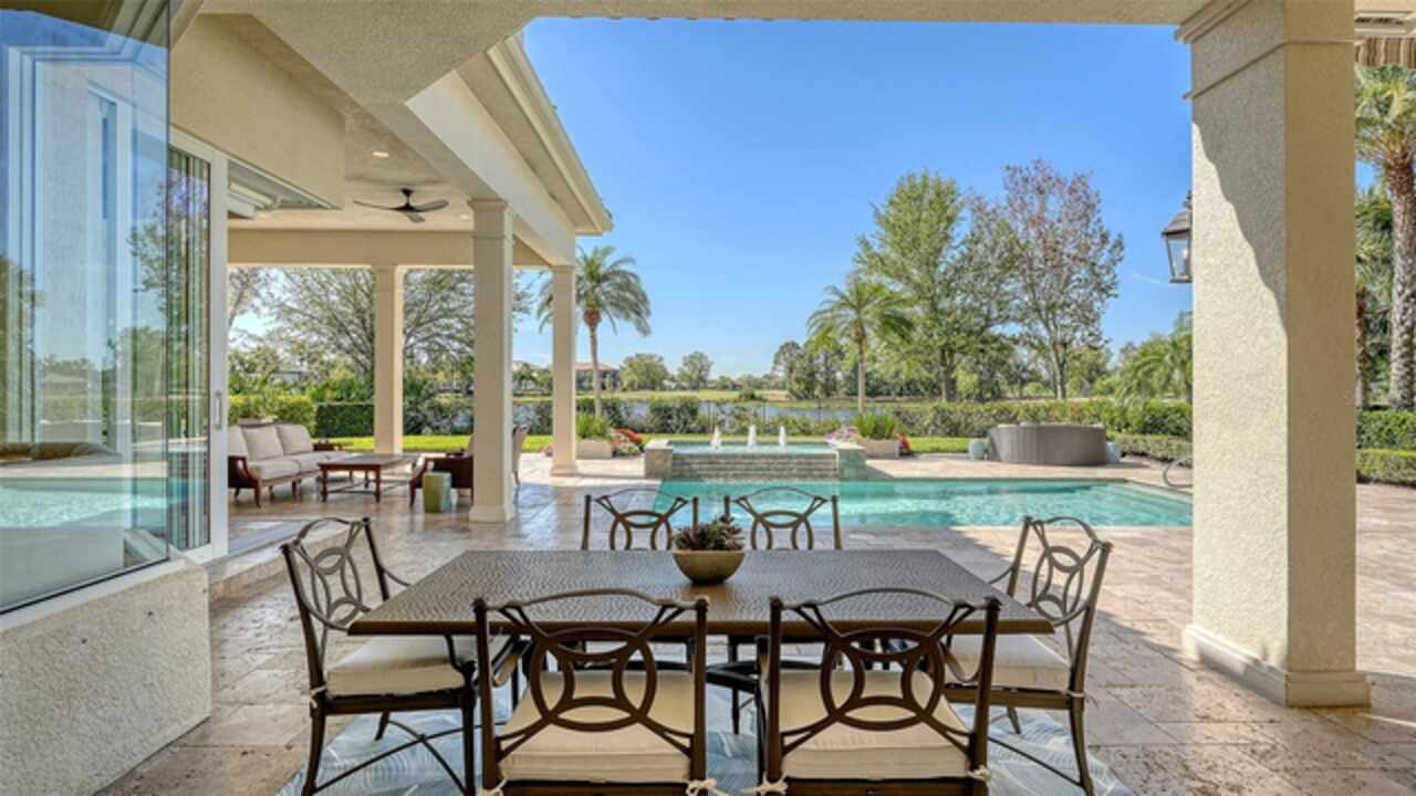 Timeless elegance meets modern luxury in this stunning 4-bedroom, 4.5-bath CERTIFIED FLORIDA GREEN custom home, situated on a private, fenced lot of over half an acre in the prestigious “Estates” section of Sarasota’s finest, The Founders Club. The Founders Club is an award-winning private member-owned golf club community offering 24 hour guarded gate access, just 262 homes nestled along 700 acres of lakes, fairways, and nature preserves. Originally a London Bay showcase model, the owners have transformed the residence into a stunning serene, spa-inspired retreat with one of Sarasota’s top designers, Angela Rodriguez Interiors. Upon entering the grand iron glass double doors, you are immediately captivated by the magnificent setting of the property and its breathtaking views looking out to the pool, pond, preserve and the club’s famous Robert Trent Jones Jr golf course. A dramatic courtyard entry, enhanced by refreshed landscaping and ambient lighting, leads you in through the intricate architectural elements including coffered ceilings, elegant crown moldings, 8-inch baseboards, Phillip Jeffries wall coverings, Serena and Lily décor accents, and chiseled travertine flooring that extends seamlessly to the outdoor living areas through 10-foot disappearing corner sliders. A chef’s kitchen, complete with Cambria quartz countertops, a Calacatta Gold backsplash, cabinet-front Monogram appliances, remote-controlled shades, and a built-in banquette with a custom-crafted wood table (that does convey with the home) flows effortlessly into the great family room. A dedicated dining room and versatile bonus/billiard room add character and function, while the private office supports today’s lifestyle needs. The serene owner’s suite occupies its own private wing. This luxurious space includes a cozy sitting area, expansive walk-in closet, freestanding soaking tub, oversized rain shower, double quartz vanity with makeup station, and refined designer finishes. Outdoors enjoy a true resort-style sanctuary with two covered lanais, an open-air pool, a raised spa with fountains, and a fully equipped outdoor kitchen. Retractable awnings extend shade over the veranda for relaxed dining and entertaining. Throughout the home, fresh paint, statement walls, tongue-and-groove ceilings, and mercury glass details add texture and polish. Additional features include 3 new HVAC systems installed this year, motorized blinds and plantation shutters throughout, hurricane impact windows and sliders, an oversized 3-car motor court garage with temp-controlled storage space. Every inch of this home has been thoughtfully designed to impress not only beauty but peace of mind and energy efficiency, as this home offers a suite of smart and energy-efficient upgrades: a new whole-house gas water heater, Control4 smart lighting and sound, a Halo water purification system, a full-house Generac generator, hurricane impact windows and sliders helping earn its status as a Florida Green Certified Home issued by the Florida Green Building Coalition. Residents of The Founders Club enjoy access to tennis courts, a sports court, playground, and community center. This extraordinary residence exudes refined sophistication, all within a short drive to Sarasota International Airport, shopping, dining and Sarasota’s rich art’s culture such as the Ringling Museum, Marie Selby Gardens, Van Wezel Performing Art Hall, Sarasota Orchestra, Asolo Theater.