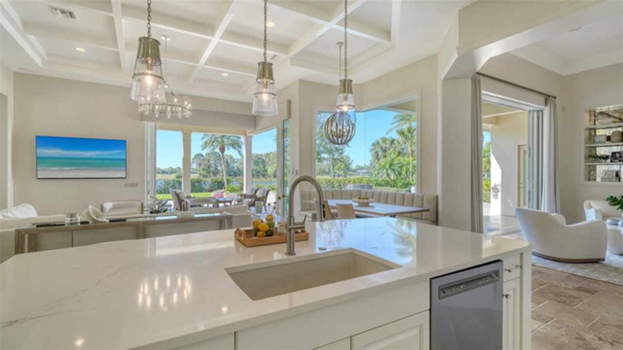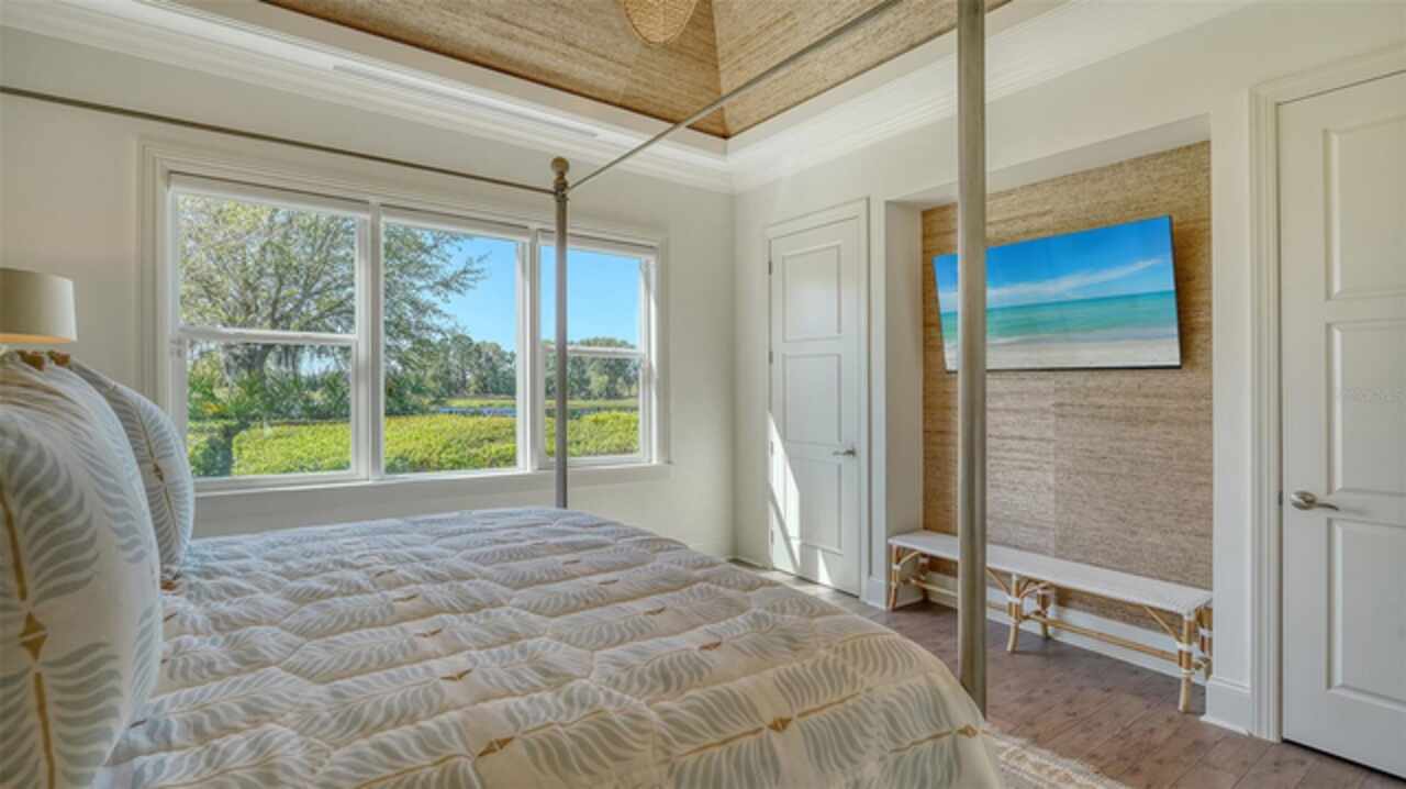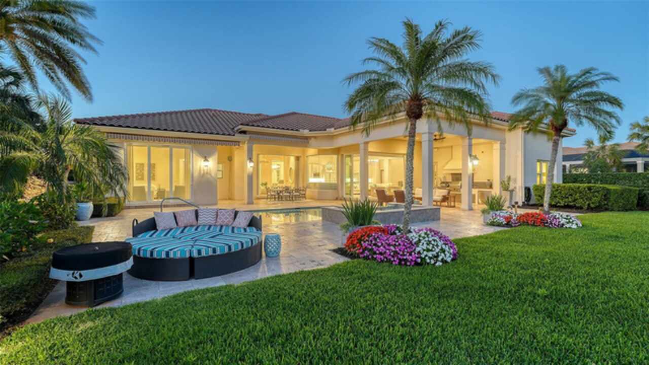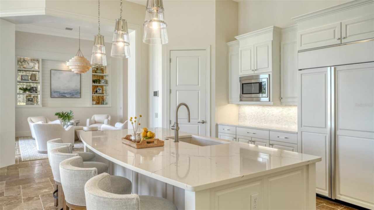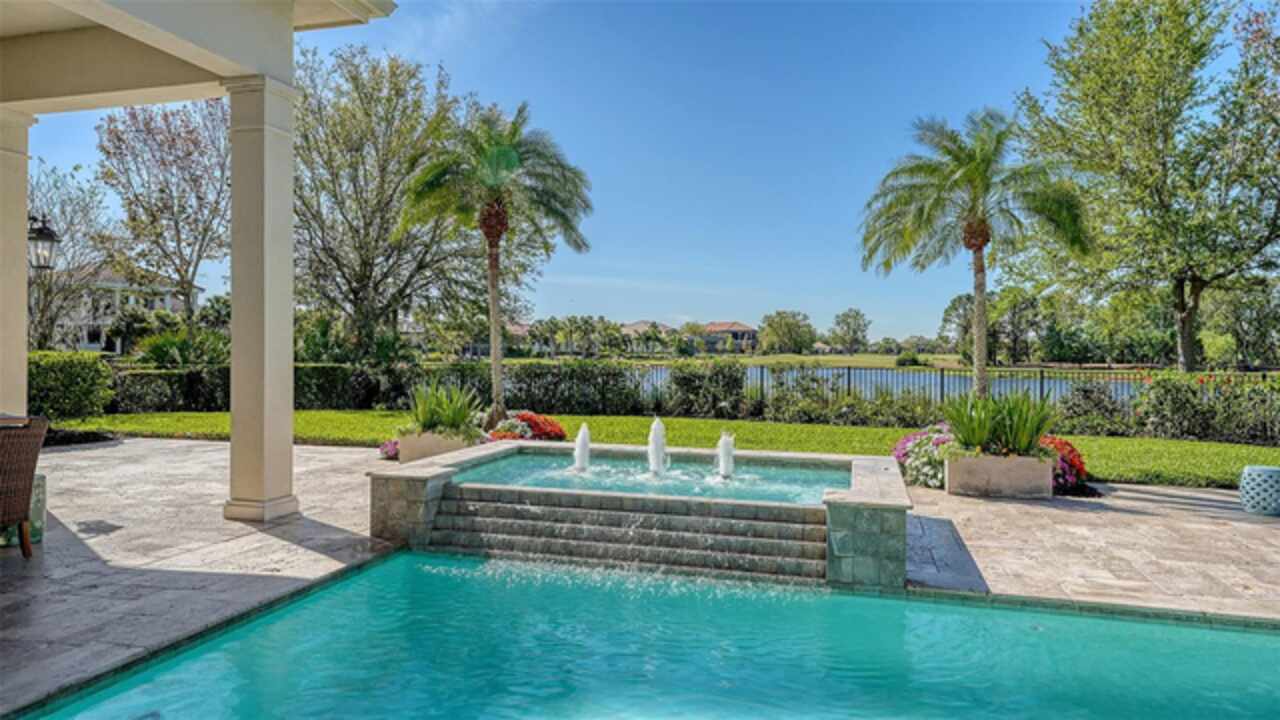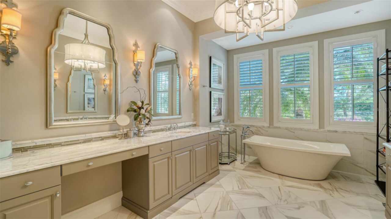 Timeless elegance meets modern luxury in this stunning 4-bedroom, 4.5-bath CERTIFIED FLORIDA GREEN custom home, situated on a private, fenced lot of over half an acre in the prestigious “Estates” section of Sarasota’s finest, The Founders Club. The Founders Club is an award-winning private member-owned golf club community offering 24 hour guarded gate access, just 262 homes nestled along 700 acres of lakes, fairways, and nature preserves. Originally a London Bay showcase model, the owners have transformed the residence into a stunning serene, spa-inspired retreat with one of Sarasota’s top designers, Angela Rodriguez Interiors. Upon entering the grand iron glass double doors, you are immediately captivated by the magnificent setting of the property and its breathtaking views looking out to the pool, pond, preserve and the club’s famous Robert Trent Jones Jr golf course. A dramatic courtyard entry, enhanced by refreshed landscaping and ambient lighting, leads you in through the intricate architectural elements including coffered ceilings, elegant crown moldings, 8-inch baseboards, Phillip Jeffries wall coverings, Serena and Lily décor accents, and chiseled travertine flooring that extends seamlessly to the outdoor living areas through 10-foot disappearing corner sliders. A chef’s kitchen, complete with Cambria quartz countertops, a Calacatta Gold backsplash, cabinet-front Monogram appliances, remote-controlled shades, and a built-in banquette with a custom-crafted wood table (that does convey with the home) flows effortlessly into the great family room. A dedicated dining room and versatile bonus/billiard room add character and function, while the private office supports today’s lifestyle needs. The serene owner’s suite occupies its own private wing. This luxurious space includes a cozy sitting area, expansive walk-in closet, freestanding soaking tub, oversized rain shower, double quartz vanity with makeup station, and refined designer finishes. Outdoors enjoy a true resort-style sanctuary with two covered lanais, an open-air pool, a raised spa with fountains, and a fully equipped outdoor kitchen. Retractable awnings extend shade over the veranda for relaxed dining and entertaining. Throughout the home, fresh paint, statement walls, tongue-and-groove ceilings, and mercury glass details add texture and polish. Additional features include 3 new HVAC systems installed this year, motorized blinds and plantation shutters throughout, hurricane impact windows and sliders, an oversized 3-car motor court garage with temp-controlled storage space. Every inch of this home has been thoughtfully designed to impress not only beauty but peace of mind and energy efficiency, as this home offers a suite of smart and energy-efficient upgrades: a new whole-house gas water heater, Control4 smart lighting and sound, a Halo water purification system, a full-house Generac generator, hurricane impact windows and sliders helping earn its status as a Florida Green Certified Home issued by the Florida Green Building Coalition. Residents of The Founders Club enjoy access to tennis courts, a sports court, playground, and community center. This extraordinary residence exudes refined sophistication, all within a short drive to Sarasota International Airport, shopping, dining and Sarasota’s rich art’s culture such as the Ringling Museum, Marie Selby Gardens, Van Wezel Performing Art Hall, Sarasota Orchestra, Asolo Theater.