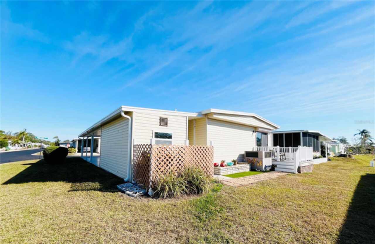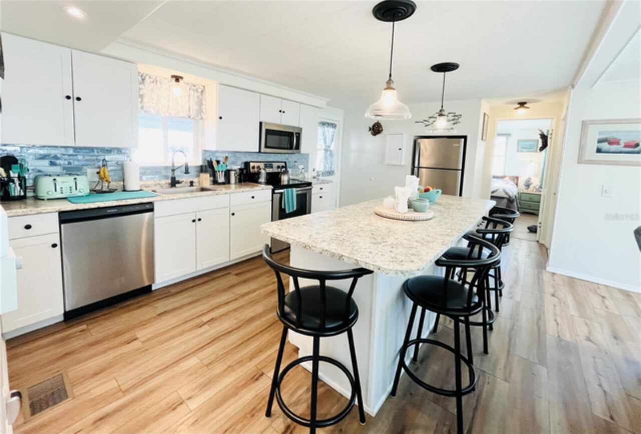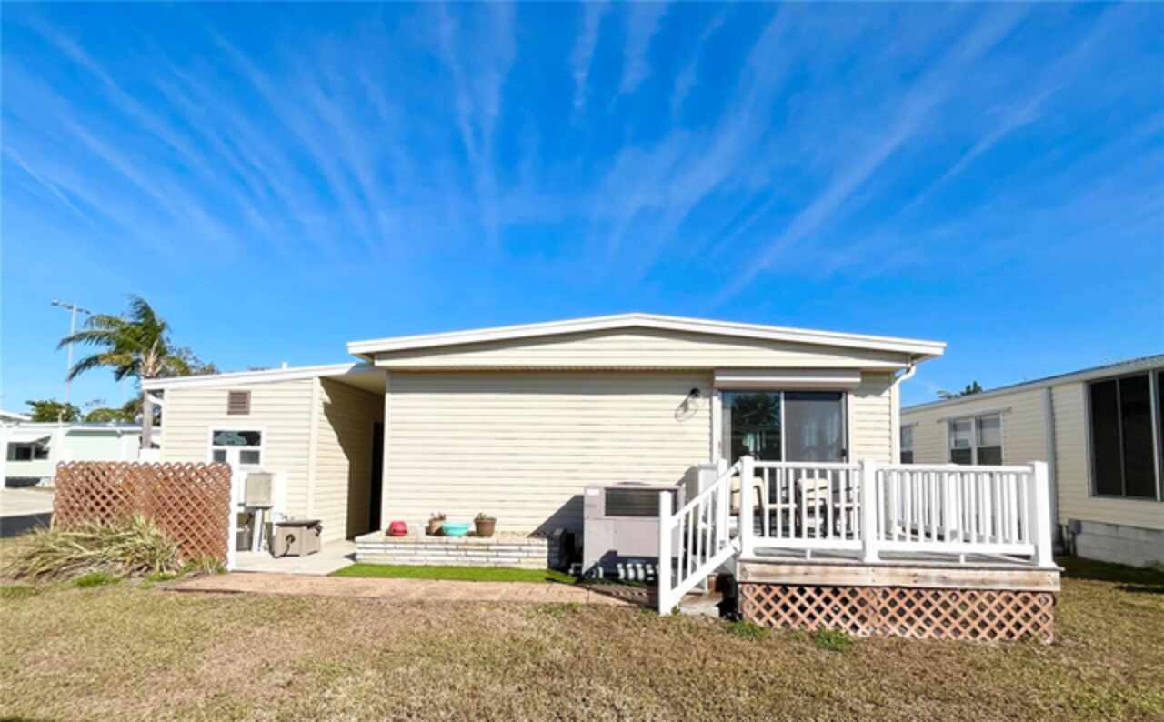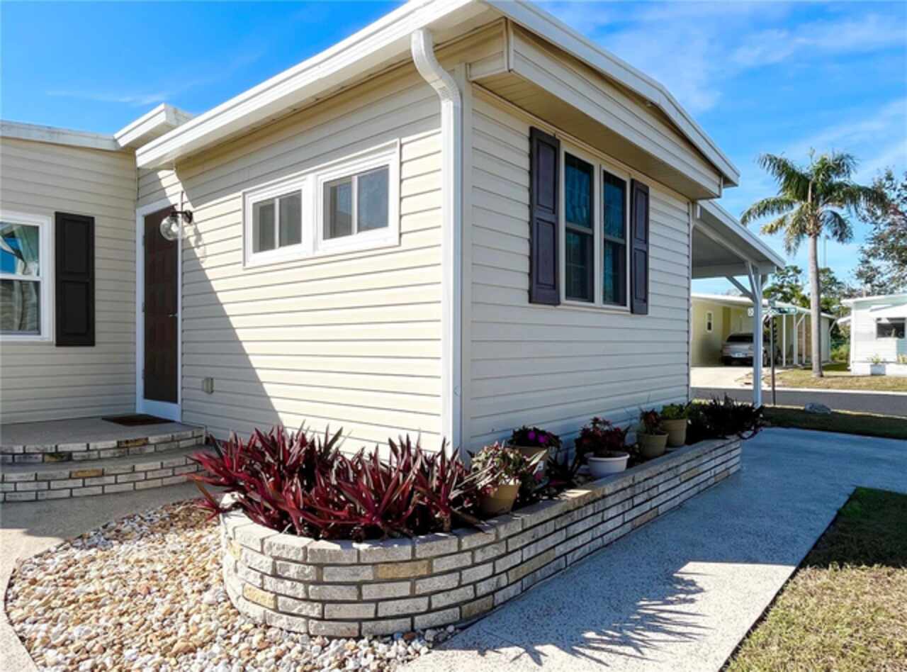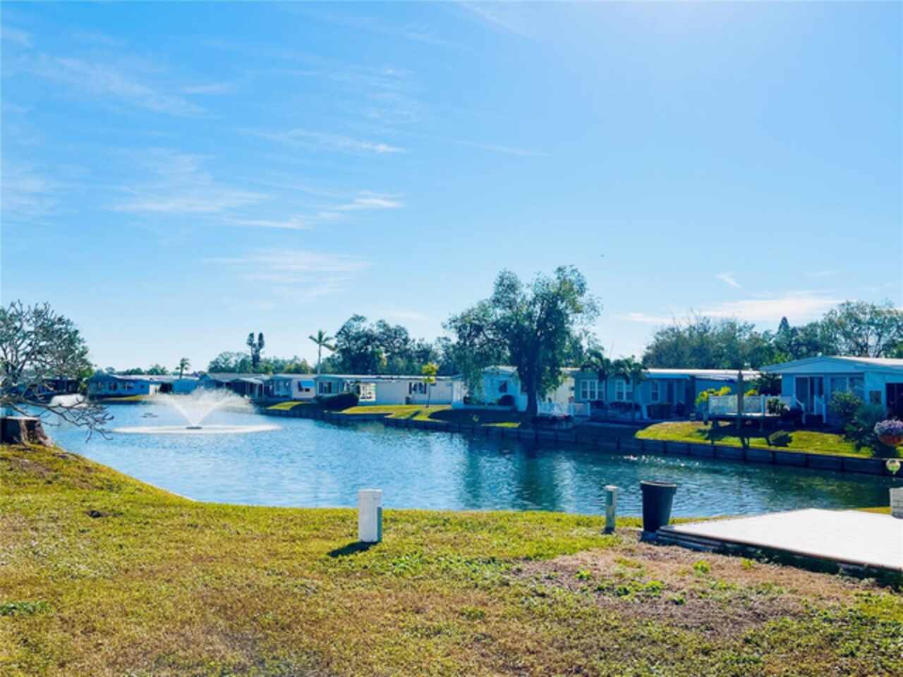 So many pluses to this home! Relax on the back DECK overlooking views of the CANAL and FOUNTAIN on this CORNER lot UPDATED open concept TURNKEY coastal beach style home. Whew that's a lot of pluses and more to add! Welcome your guest thru the epoxy front patio area or from the epoxy drive carport into a tranquil open concept with the spacious kitchen overlooking the living and dining room. The first thing that catches your eye in this remodeled kitchen is the extra large island and gorgeous iridescent glass backsplash. Extra island seating gives ample space for entertaining guest and tackling your favorite recipes. Final touches include the white shaker cabinets, a farm sink and stainless appliances. The living room has comfortable furnishings with 5 places to recline and a flat screen TV. The dining space is quaint and the farm style table is versatile allowing seating for 6 or drop a side and use it as a desk space or buffet serving table. The primary suite is so roomy that there is a king bed set and a cozy living space with love seat recliner and TV. Additionally there are 3 closets, access to the full bath and sliders to the private deck space. The main bathroom has been updated and the farm bench gives that homey touch. The guest bedroom has a queen bed and half bath. The washer and dryer, water heater and utility sink are housed in the 144sf shed that gives plenty of room for additional storage space. Updates include: Galv Metal Roof Over 2018, New carport 2018, Vinyl siding added 2018, Double pane windows approx 2021, HVAC 2011 with replaced blower motor, Vapor barrier was updated and 10 pillars. Kitchen opened to main living and remodeled 2018, Smart core engineered pro luxury vinyl flooring throughout main living-sleeping areas and 3/4" plywood subfloors 2018, Bathrooms have concrete vinyl flooring, Main bathroom remodeled 2018 with access to primary bedroom and main living area. Drywall in parts of living room/bathroom and guest bedroom. Water lines are copper with shutoffs, and the sewer line is original. The gated 90 acre community boast a low maintenance fee with its vast amenities starting with the spacious Clubhouse outfitted with a full commercial cook kitchen, event stage, audio/visual, dance floor, state of the art fitness room, activities hall, library with books/movies/puzzles and a pool table. Outside recreation includes an extra large heated pool with a handicap ramp, a spacious kidney shaped hot tub, ample umbrella tables and lounge chairs and updated shower rooms. Oak trees shade the beautiful park area, picnic tables and a community grill. Additional amenities to enjoy are the community putt putt course, bocce ball, ping pong, horse shoes and corn hole. Oakwood Manor is a vibrant community with numerous social events and activities. Conveniently located adjacent to Legacy Trail and 12 newer pickle ball courts. Just a short drive to our crystal sand beaches, downtown area, the marina, fishing pier, local golf courses, shopping, variety of restaurants, the museum, SRQ airport, SMH and Doctors hospitals. Please note that Oakwood is a 55+, no pet, no motorcycle Park.