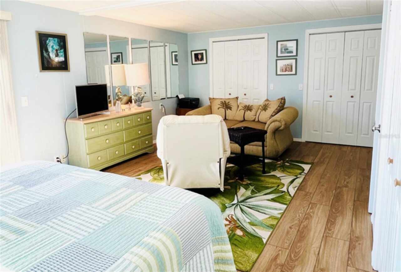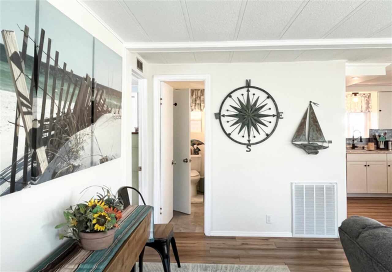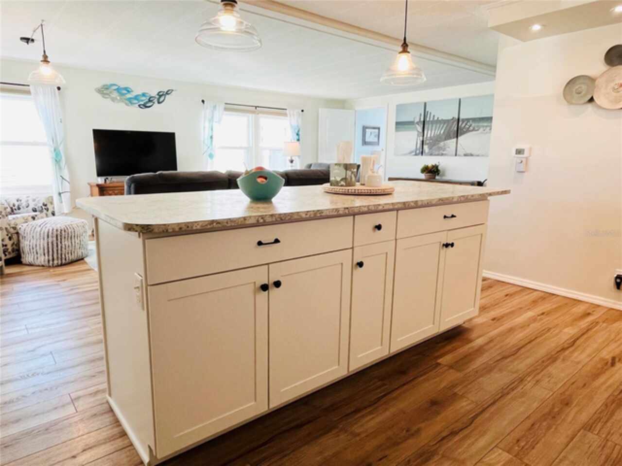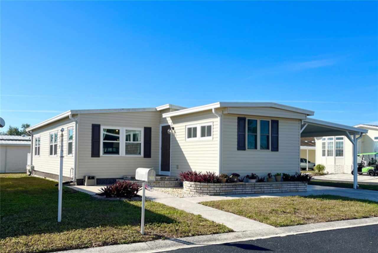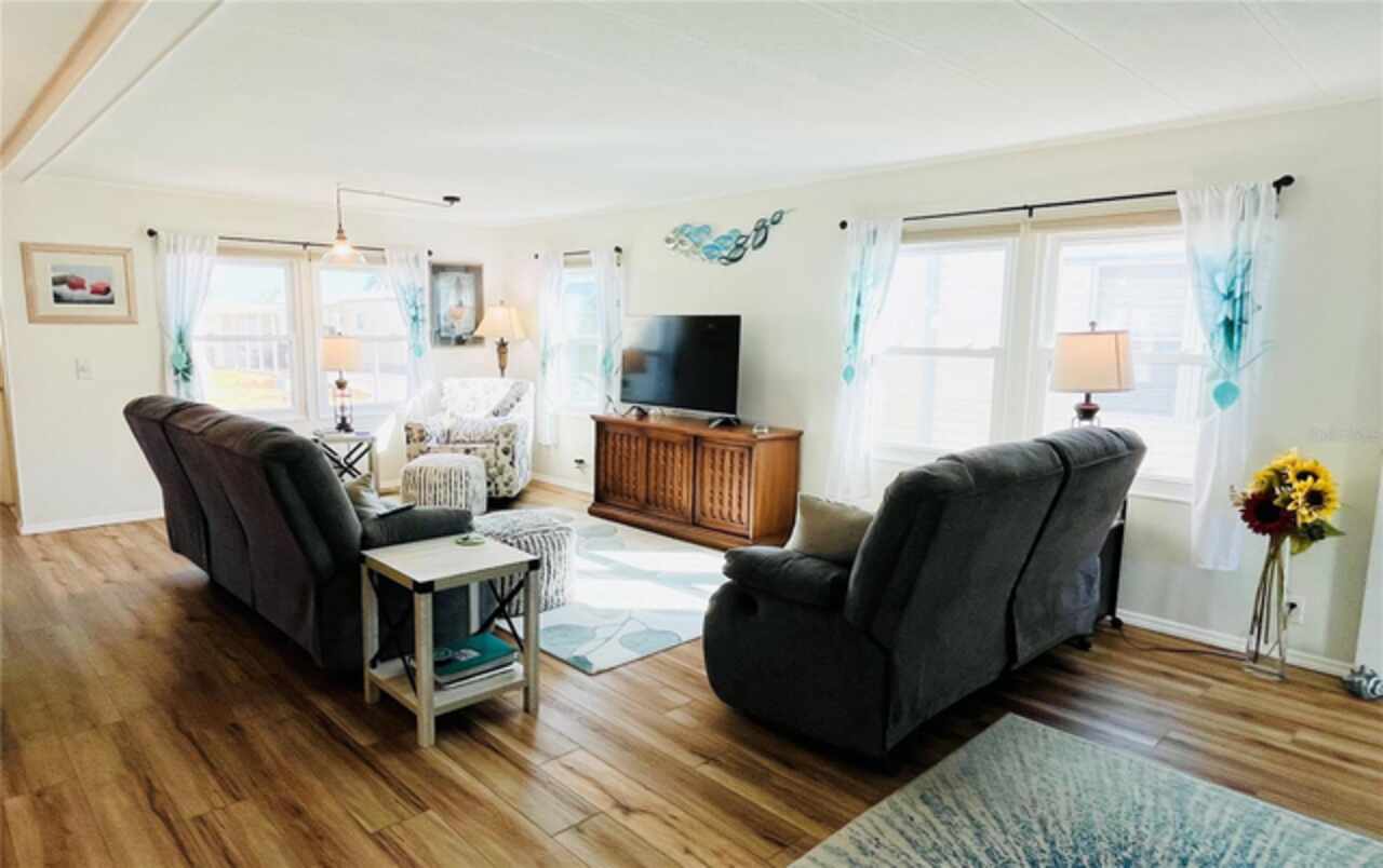 So many pluses to this home! Relax on the back DECK overlooking views of the CANAL and FOUNTAIN on this CORNER lot UPDATED open concept TURNKEY coastal beach style home. Whew that's a lot of pluses and more to add! Welcome your guest thru the epoxy front patio area or from the epoxy drive carport into a tranquil open concept with the spacious kitchen overlooking the living and dining room. The first thing that catches your eye in this remodeled kitchen is the extra large island and gorgeous iridescent glass backsplash. Extra island seating gives ample space for entertaining guest and tackling your favorite recipes. Final touches include the white shaker cabinets, a farm sink and stainless appliances. The living room has comfortable furnishings with 5 places to recline and a flat screen TV. The dining space is quaint and the farm style table is versatile allowing seating for 6 or drop a side and use it as a desk space or buffet serving table. The primary suite is so roomy that there is a king bed set and a cozy living space with love seat recliner and TV. Additionally there are 3 closets, access to the full bath and sliders to the private deck space. The main bathroom has been updated and the farm bench gives that homey touch. The guest bedroom has a queen bed and half bath. The washer and dryer, water heater and utility sink are housed in the 144sf shed that gives plenty of room for additional storage space. Updates include: Galv Metal Roof Over 2018, New carport 2018, Vinyl siding added 2018, Double pane windows approx 2021, HVAC 2011 with replaced blower motor, Vapor barrier was updated and 10 pillars. Kitchen opened to main living and remodeled 2018, Smart core engineered pro luxury vinyl flooring throughout main living-sleeping areas and 3/4" plywood subfloors 2018, Bathrooms have concrete vinyl flooring, Main bathroom remodeled 2018 with access to primary bedroom and main living area. Drywall in parts of living room/bathroom and guest bedroom. Water lines are copper with shutoffs, and the sewer line is original. The gated 90 acre community boast a low maintenance fee with its vast amenities starting with the spacious Clubhouse outfitted with a full commercial cook kitchen, event stage, audio/visual, dance floor, state of the art fitness room, activities hall, library with books/movies/puzzles and a pool table. Outside recreation includes an extra large heated pool with a handicap ramp, a spacious kidney shaped hot tub, ample umbrella tables and lounge chairs and updated shower rooms. Oak trees shade the beautiful park area, picnic tables and a community grill. Additional amenities to enjoy are the community putt putt course, bocce ball, ping pong, horse shoes and corn hole. Oakwood Manor is a vibrant community with numerous social events and activities. Conveniently located adjacent to Legacy Trail and 12 newer pickle ball courts. Just a short drive to our crystal sand beaches, downtown area, the marina, fishing pier, local golf courses, shopping, variety of restaurants, the museum, SRQ airport, SMH and Doctors hospitals. Please note that Oakwood is a 55+, no pet, no motorcycle Park.