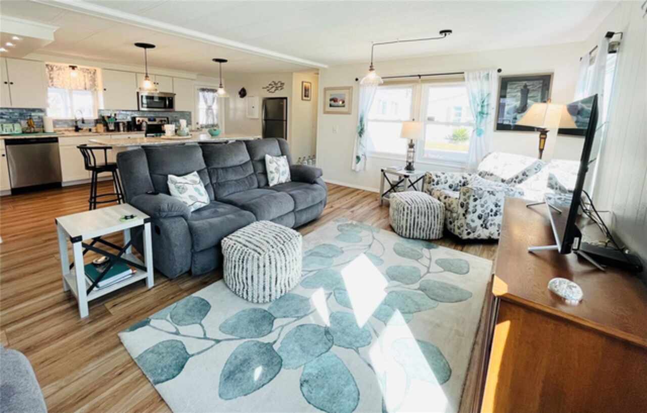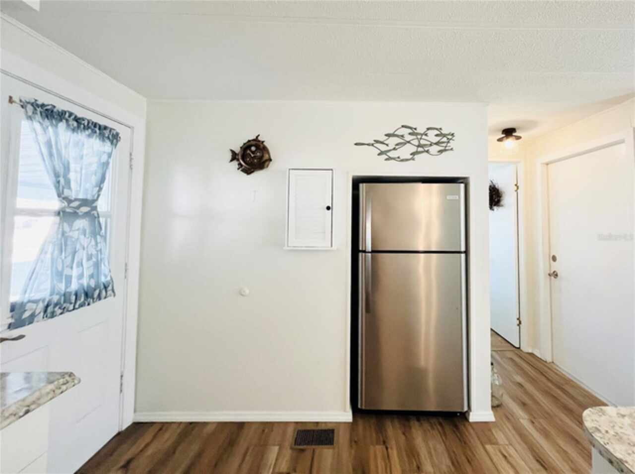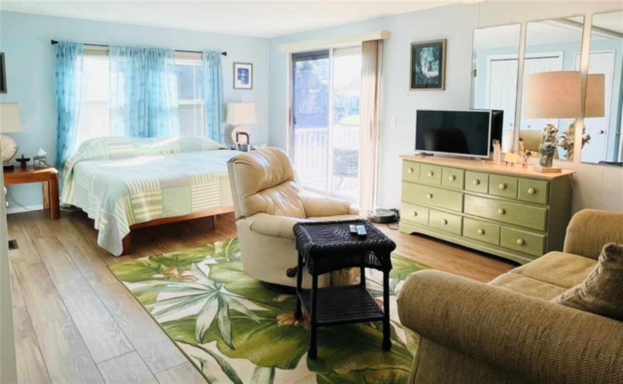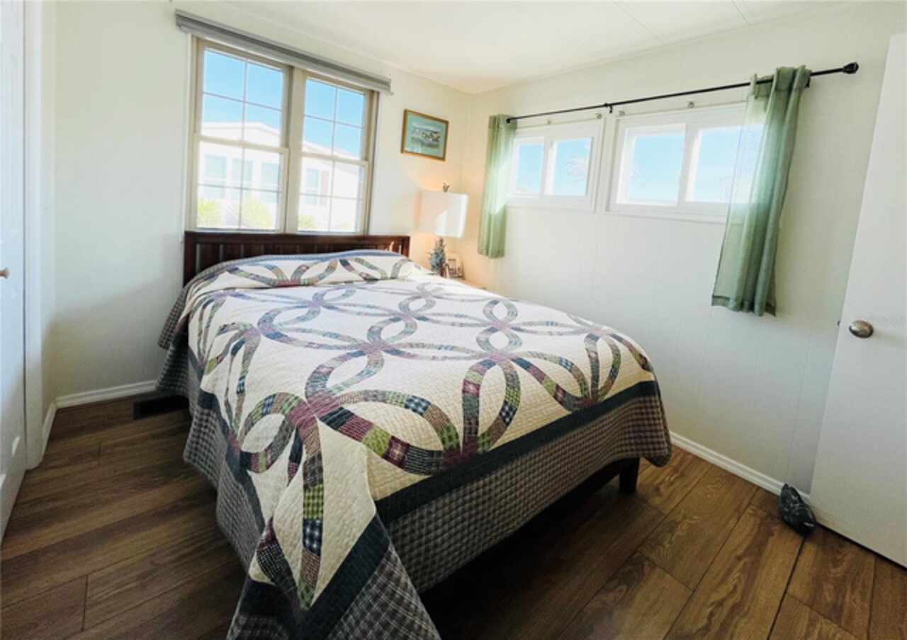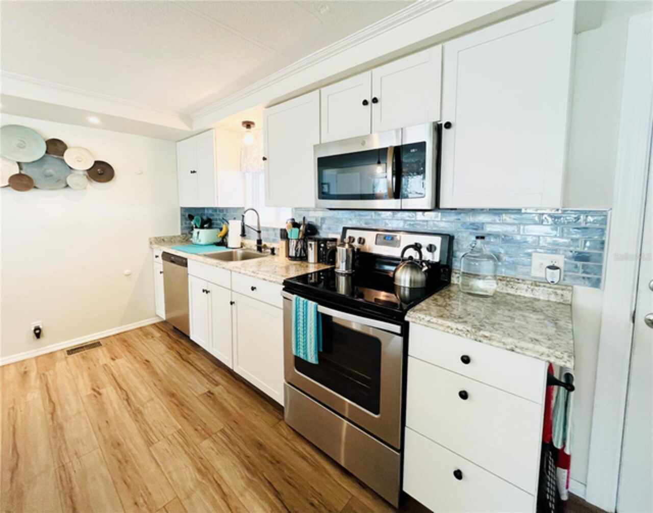 So many pluses to this home! Relax on the back DECK overlooking views of the CANAL and FOUNTAIN on this CORNER lot UPDATED open concept TURNKEY coastal beach style home. Whew that's a lot of pluses and more to add! Welcome your guest thru the epoxy front patio area or from the epoxy drive carport into a tranquil open concept with the spacious kitchen overlooking the living and dining room. The first thing that catches your eye in this remodeled kitchen is the extra large island and gorgeous iridescent glass backsplash. Extra island seating gives ample space for entertaining guest and tackling your favorite recipes. Final touches include the white shaker cabinets, a farm sink and stainless appliances. The living room has comfortable furnishings with 5 places to recline and a flat screen TV. The dining space is quaint and the farm style table is versatile allowing seating for 6 or drop a side and use it as a desk space or buffet serving table. The primary suite is so roomy that there is a king bed set and a cozy living space with love seat recliner and TV. Additionally there are 3 closets, access to the full bath and sliders to the private deck space. The main bathroom has been updated and the farm bench gives that homey touch. The guest bedroom has a queen bed and half bath. The washer and dryer, water heater and utility sink are housed in the 144sf shed that gives plenty of room for additional storage space. Updates include: Galv Metal Roof Over 2018, New carport 2018, Vinyl siding added 2018, Double pane windows approx 2021, HVAC 2011 with replaced blower motor, Vapor barrier was updated and 10 pillars. Kitchen opened to main living and remodeled 2018, Smart core engineered pro luxury vinyl flooring throughout main living-sleeping areas and 3/4" plywood subfloors 2018, Bathrooms have concrete vinyl flooring, Main bathroom remodeled 2018 with access to primary bedroom and main living area. Drywall in parts of living room/bathroom and guest bedroom. Water lines are copper with shutoffs, and the sewer line is original. The gated 90 acre community boast a low maintenance fee with its vast amenities starting with the spacious Clubhouse outfitted with a full commercial cook kitchen, event stage, audio/visual, dance floor, state of the art fitness room, activities hall, library with books/movies/puzzles and a pool table. Outside recreation includes an extra large heated pool with a handicap ramp, a spacious kidney shaped hot tub, ample umbrella tables and lounge chairs and updated shower rooms. Oak trees shade the beautiful park area, picnic tables and a community grill. Additional amenities to enjoy are the community putt putt course, bocce ball, ping pong, horse shoes and corn hole. Oakwood Manor is a vibrant community with numerous social events and activities. Conveniently located adjacent to Legacy Trail and 12 newer pickle ball courts. Just a short drive to our crystal sand beaches, downtown area, the marina, fishing pier, local golf courses, shopping, variety of restaurants, the museum, SRQ airport, SMH and Doctors hospitals. Please note that Oakwood is a 55+, no pet, no motorcycle Park.
