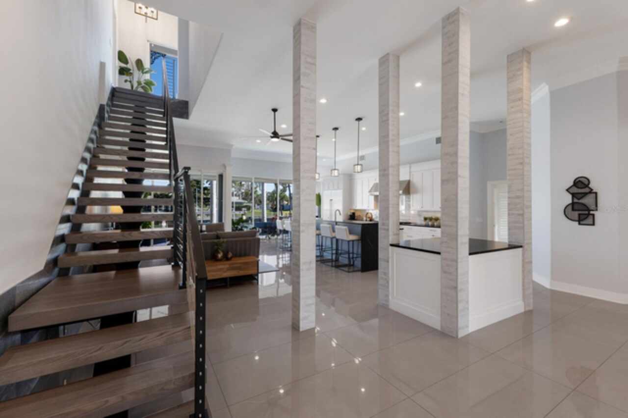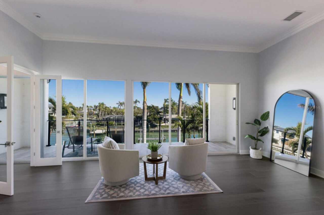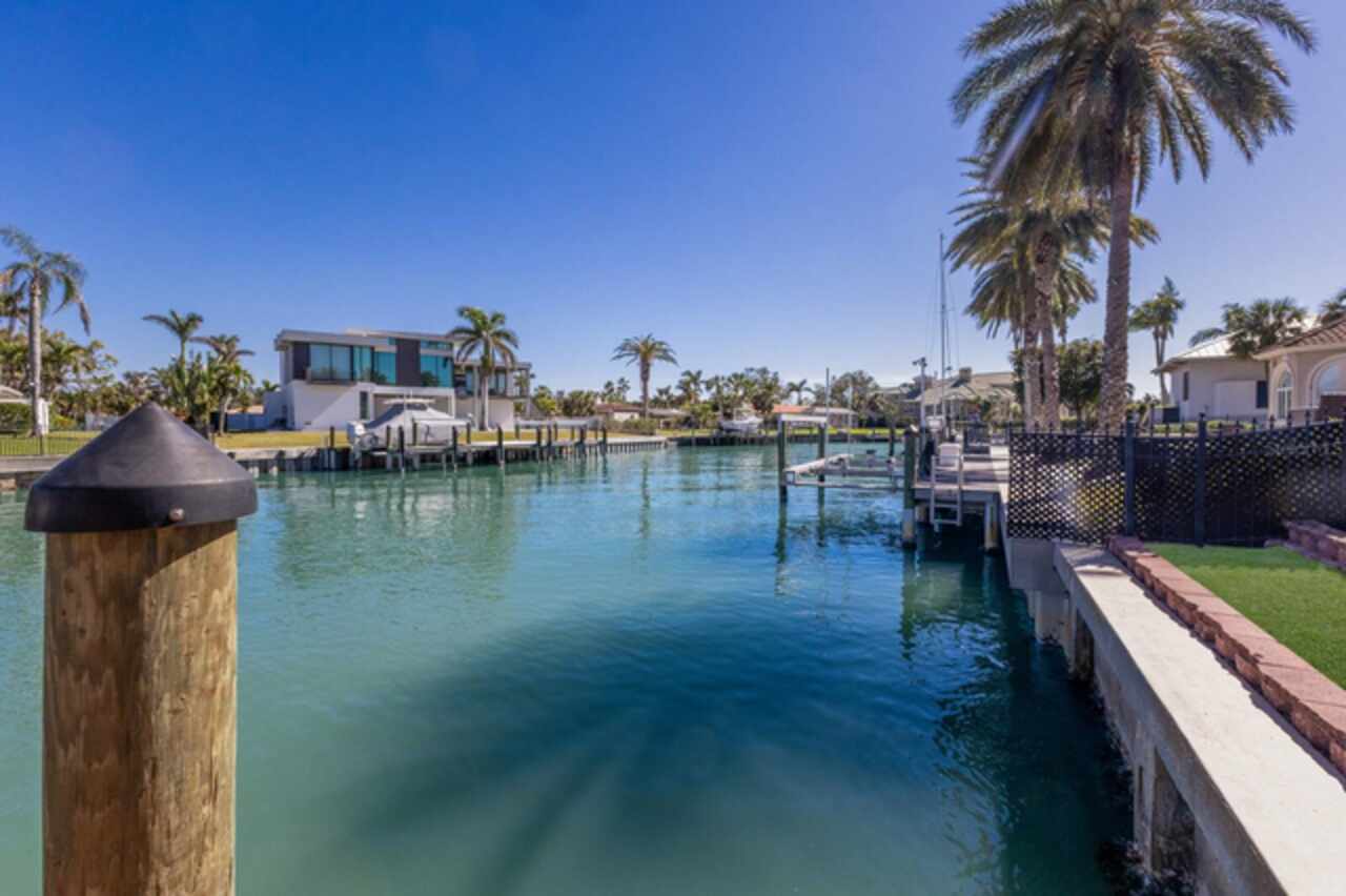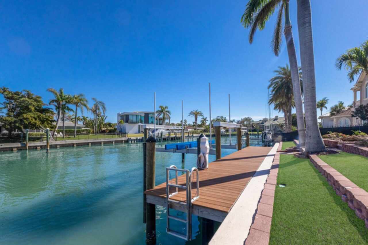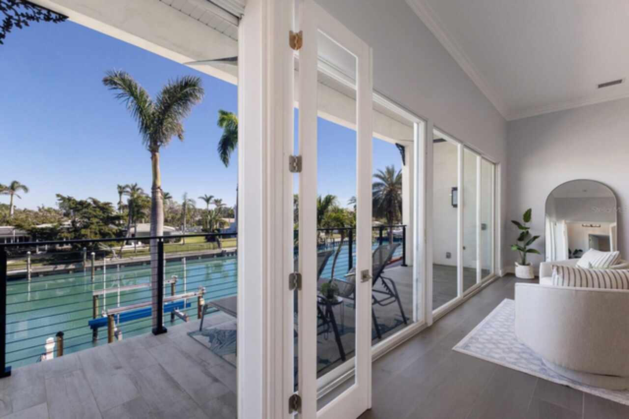 LOWEST PRICE PER SQ FT FOR WATERFRONT PROPERTY ON BIRD KEY! A magnificent sanctuary, 12' above sea level, perfectly positioned on the coveted West end of Dolphin Waterway, this home provides unmatched privacy and serenity, framed by 100 feet of SAILBOAT WATER FRONTAGE on Bird Key's DEEPEST AND WIDEST CANAL. BRAND NEW FLAT TILE ROOF was completed August 2025. Home was completely unscathed during the storms. Newly renovated 5, 257 square feet of luxury, this architectural marvel features four bedrooms with two primary suites, one on the main and one on the second level, a yoga/media room, and four full baths. Upon entering, you'll be welcomed by an atmosphere of modern elegance with soaring ceilings and stunning 2' x 4' porcelain tile flooring. As you climb the luxurious custom modern floating metal staircase, uncover an awe-inspiring second primary suite and enter an expansive 33' x 23' retreat. This versatile space includes a full bath; two walk-in closets; sitting area, and access to a private balcony overlooking the sun-drenched pool area, Dolphin Waterway, palm trees, and occasional pelican sighting perched on one of your TWO NEW DOCKS, one with a 20, 000lb lift and one personal watercraft 4500lb lift with space for two jet skis or kayaks. The grand entrance effortlessly flows into the open dining and living rooms. An expansive redesigned contemporary kitchen is at the heart of the home, a chef's dream outfitted with stainless steel Wolf Pro Series appliances, including a dual-fed six-burner natural gas stove with an electric oven, vent, and a sleek drawer microwave. A Sub-Zero Designer Series refrigerator/freezer, Sub Zero dual-controlled refrigerators, and a Cove dishwasher famous for its whisper-quiet operation enhance your culinary experience. The soapstone waterfall island with seating for eight is highlighted by a luxurious Brazilian Marble backsplash, and solid wood Campbell cabinetry adds a touch of timeless elegance. A custom-designed kitchen pantry room and storage or prep area perfect for private parties provide all the extra space needed to keep your kitchen organized, efficient, and clutter-free. The open kitchen and family rooms make this the perfect space for entertaining guests and watching your favorite movie or sporting event. Highlighted by a warm tile accent wall and crown molding, you can enjoy the sweeping waterfront views and stunning skies from this inviting space. Retreat to the private main floor suite through double doors into a water-view sanctuary with a primary bath featuring beautiful porcelain wood texture tile, contemporary lighting, soapstone counters, dual sinks, and a spacious glass-enclosed shower. A custom-built walk-in closet further enhances this suite. Two additional bedrooms and two resort-style baths are situated on the opposite side of this split plan. An additional flex space on the second level is perfect for a theater room, yoga room, or office. Situated on a secluded cul-de-sac with two side-load garages and space for four cars. This exquisite, gated residence offers immediate access to the pristine waters of Sarasota Bay and the Gulf. Perfectly situated near St. Armands Circle, Bird Key Yacht Club, and vibrant downtown Sarasota, you will enjoy coastal living and the Bird Key lifestyle all year round. Paradise is found in this exceptional Sarasota sanctuary. Make this coastal haven your new home!