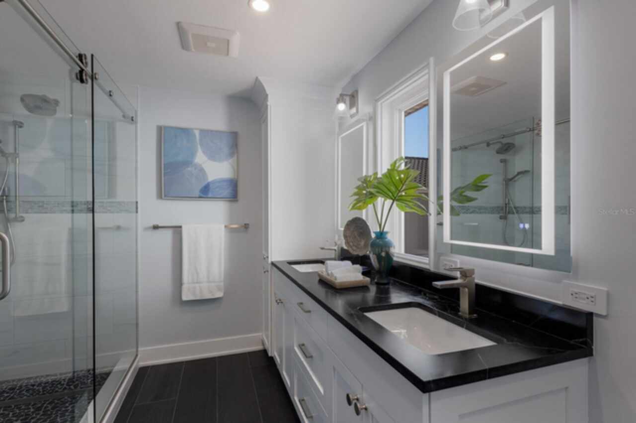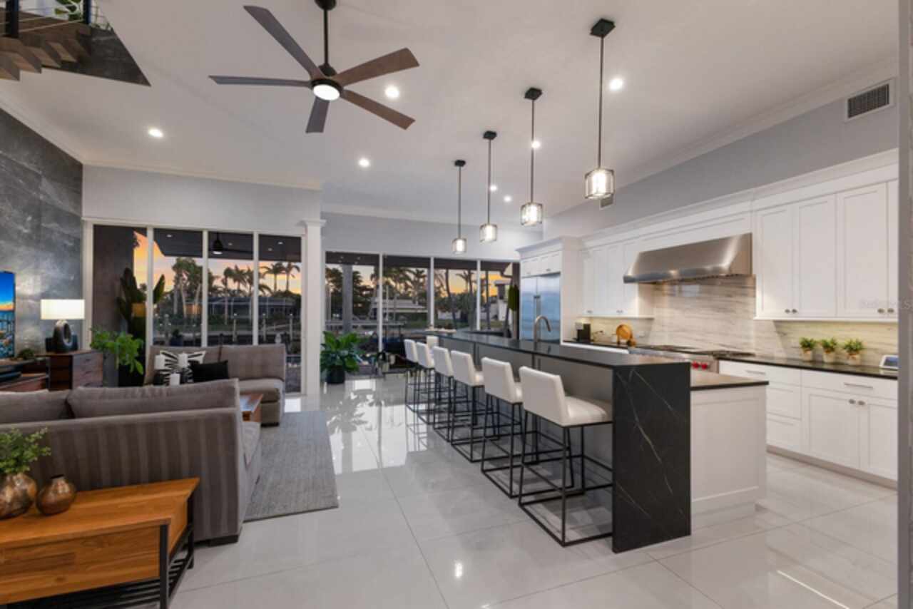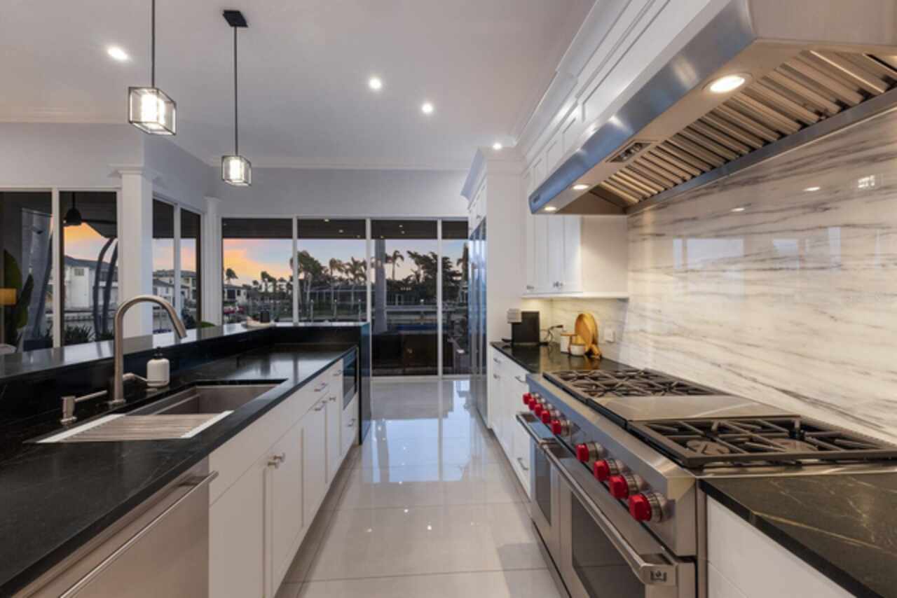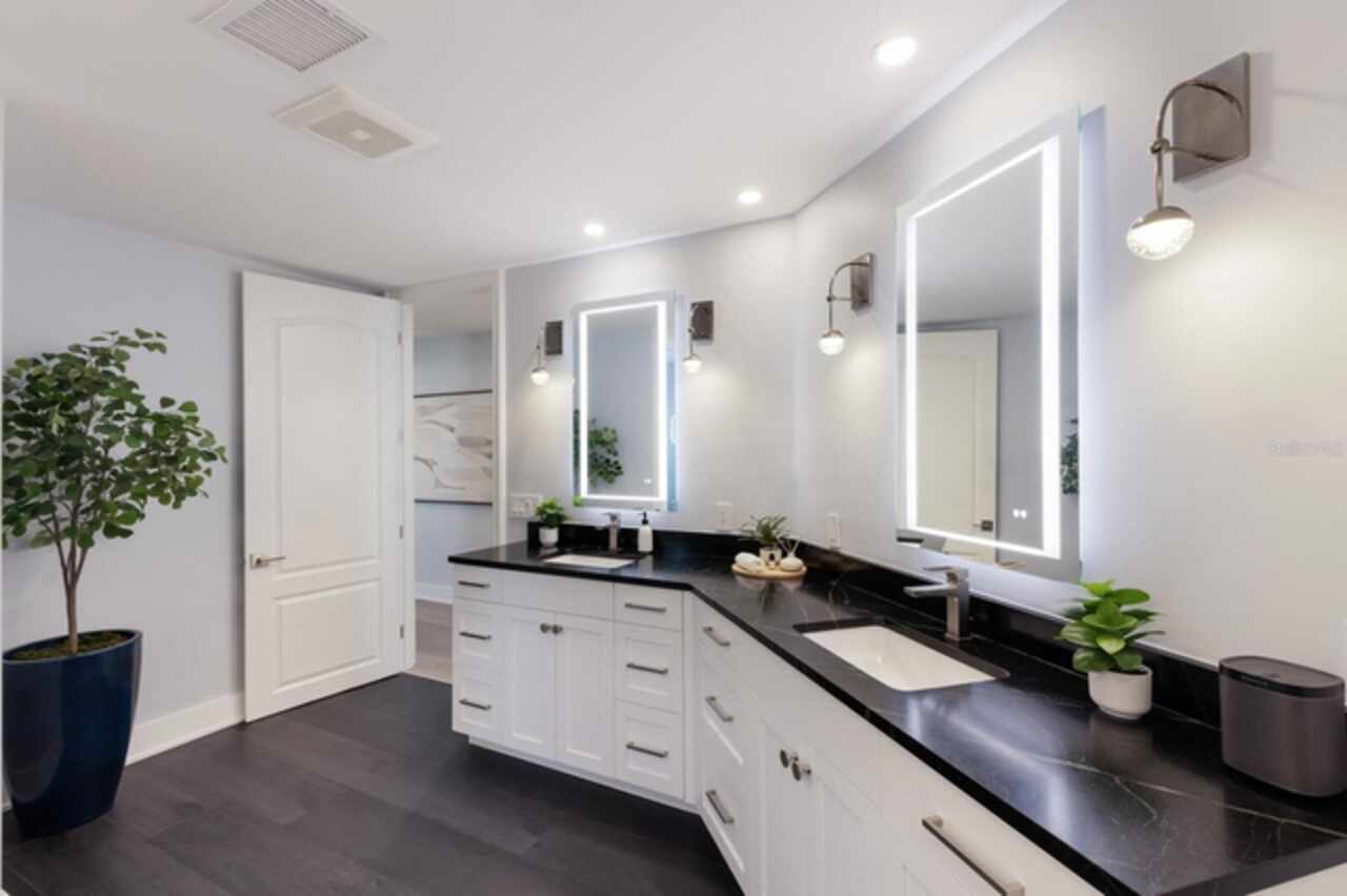 LOWEST PRICE PER SQ FT FOR WATERFRONT PROPERTY ON BIRD KEY! A magnificent sanctuary, 12' above sea level, perfectly positioned on the coveted West end of Dolphin Waterway, this home provides unmatched privacy and serenity, framed by 100 feet of SAILBOAT WATER FRONTAGE on Bird Key's DEEPEST AND WIDEST CANAL. BRAND NEW FLAT TILE ROOF was completed August 2025. Home was completely unscathed during the storms. Newly renovated 5, 257 square feet of luxury, this architectural marvel features four bedrooms with two primary suites, one on the main and one on the second level, a yoga/media room, and four full baths. Upon entering, you'll be welcomed by an atmosphere of modern elegance with soaring ceilings and stunning 2' x 4' porcelain tile flooring. As you climb the luxurious custom modern floating metal staircase, uncover an awe-inspiring second primary suite and enter an expansive 33' x 23' retreat. This versatile space includes a full bath; two walk-in closets; sitting area, and access to a private balcony overlooking the sun-drenched pool area, Dolphin Waterway, palm trees, and occasional pelican sighting perched on one of your TWO NEW DOCKS, one with a 20, 000lb lift and one personal watercraft 4500lb lift with space for two jet skis or kayaks. The grand entrance effortlessly flows into the open dining and living rooms. An expansive redesigned contemporary kitchen is at the heart of the home, a chef's dream outfitted with stainless steel Wolf Pro Series appliances, including a dual-fed six-burner natural gas stove with an electric oven, vent, and a sleek drawer microwave. A Sub-Zero Designer Series refrigerator/freezer, Sub Zero dual-controlled refrigerators, and a Cove dishwasher famous for its whisper-quiet operation enhance your culinary experience. The soapstone waterfall island with seating for eight is highlighted by a luxurious Brazilian Marble backsplash, and solid wood Campbell cabinetry adds a touch of timeless elegance. A custom-designed kitchen pantry room and storage or prep area perfect for private parties provide all the extra space needed to keep your kitchen organized, efficient, and clutter-free. The open kitchen and family rooms make this the perfect space for entertaining guests and watching your favorite movie or sporting event. Highlighted by a warm tile accent wall and crown molding, you can enjoy the sweeping waterfront views and stunning skies from this inviting space. Retreat to the private main floor suite through double doors into a water-view sanctuary with a primary bath featuring beautiful porcelain wood texture tile, contemporary lighting, soapstone counters, dual sinks, and a spacious glass-enclosed shower. A custom-built walk-in closet further enhances this suite. Two additional bedrooms and two resort-style baths are situated on the opposite side of this split plan. An additional flex space on the second level is perfect for a theater room, yoga room, or office. Situated on a secluded cul-de-sac with two side-load garages and space for four cars. This exquisite, gated residence offers immediate access to the pristine waters of Sarasota Bay and the Gulf. Perfectly situated near St. Armands Circle, Bird Key Yacht Club, and vibrant downtown Sarasota, you will enjoy coastal living and the Bird Key lifestyle all year round. Paradise is found in this exceptional Sarasota sanctuary. Make this coastal haven your new home!