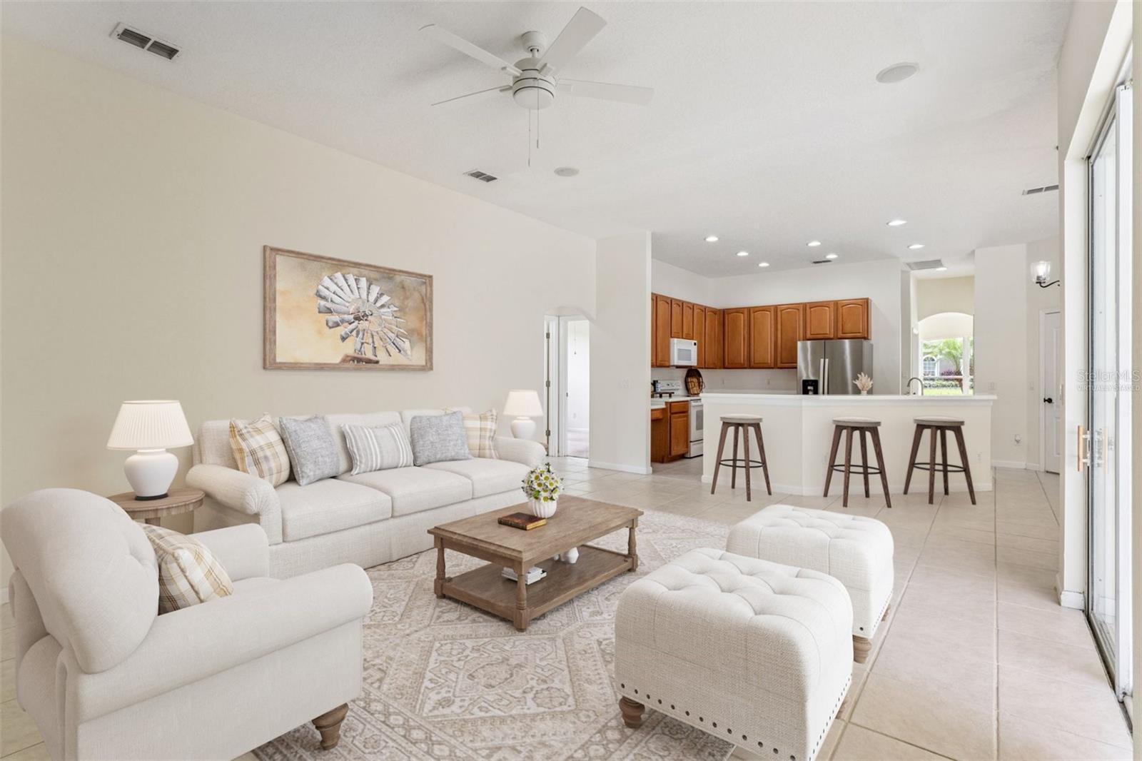 Ceiling Fans(s), Eat-in Kitchen, High Ceilings, Kitchen/Family Room Combo, Open Floorplan, Primary Bedroom Main Floor, Solid Wood Cabinets, Split Bedroom, Thermostat, Walk-In Closet(s)