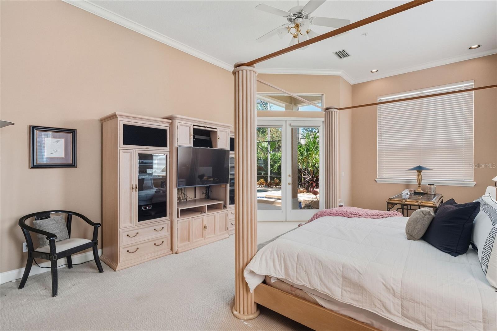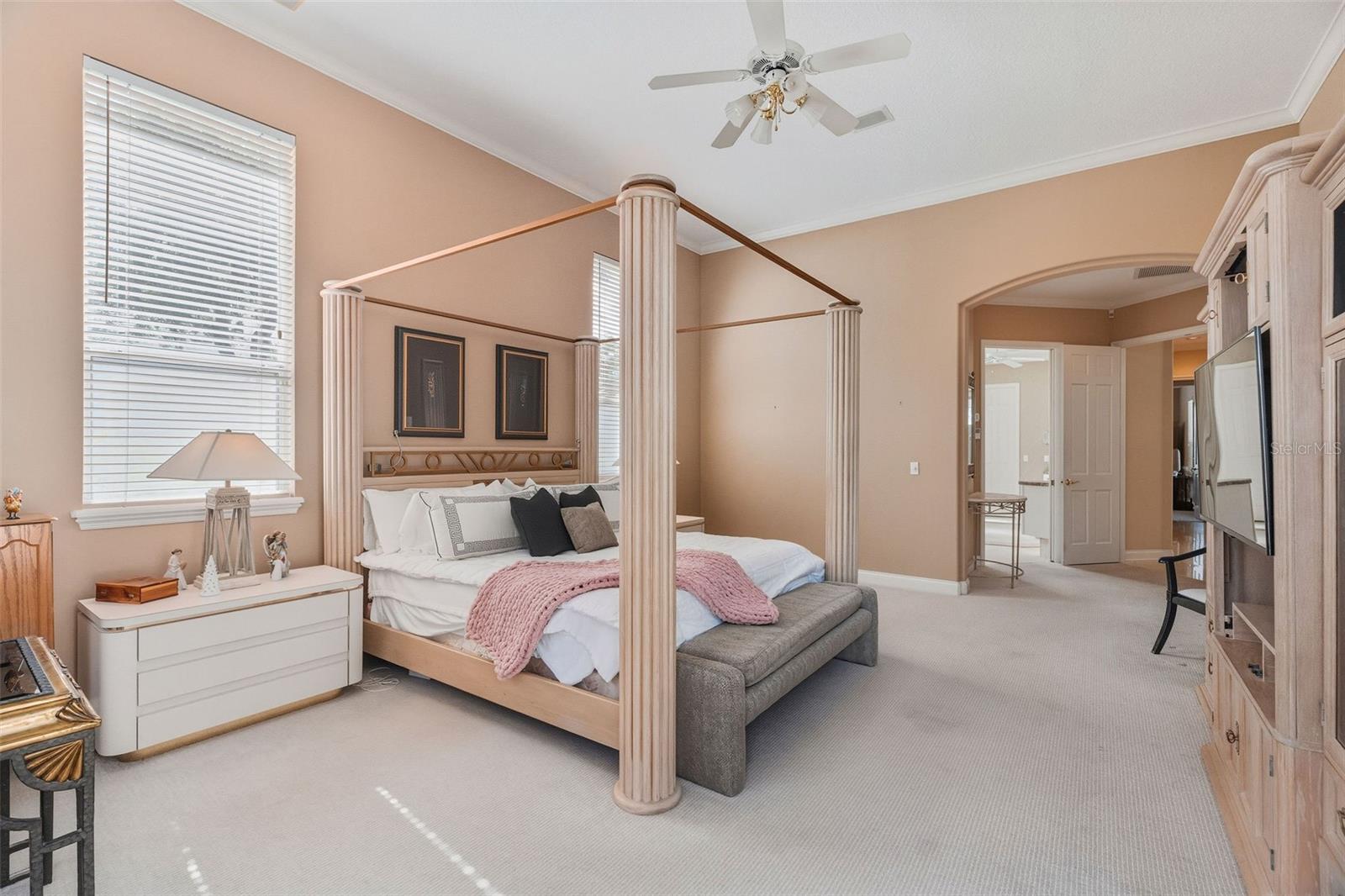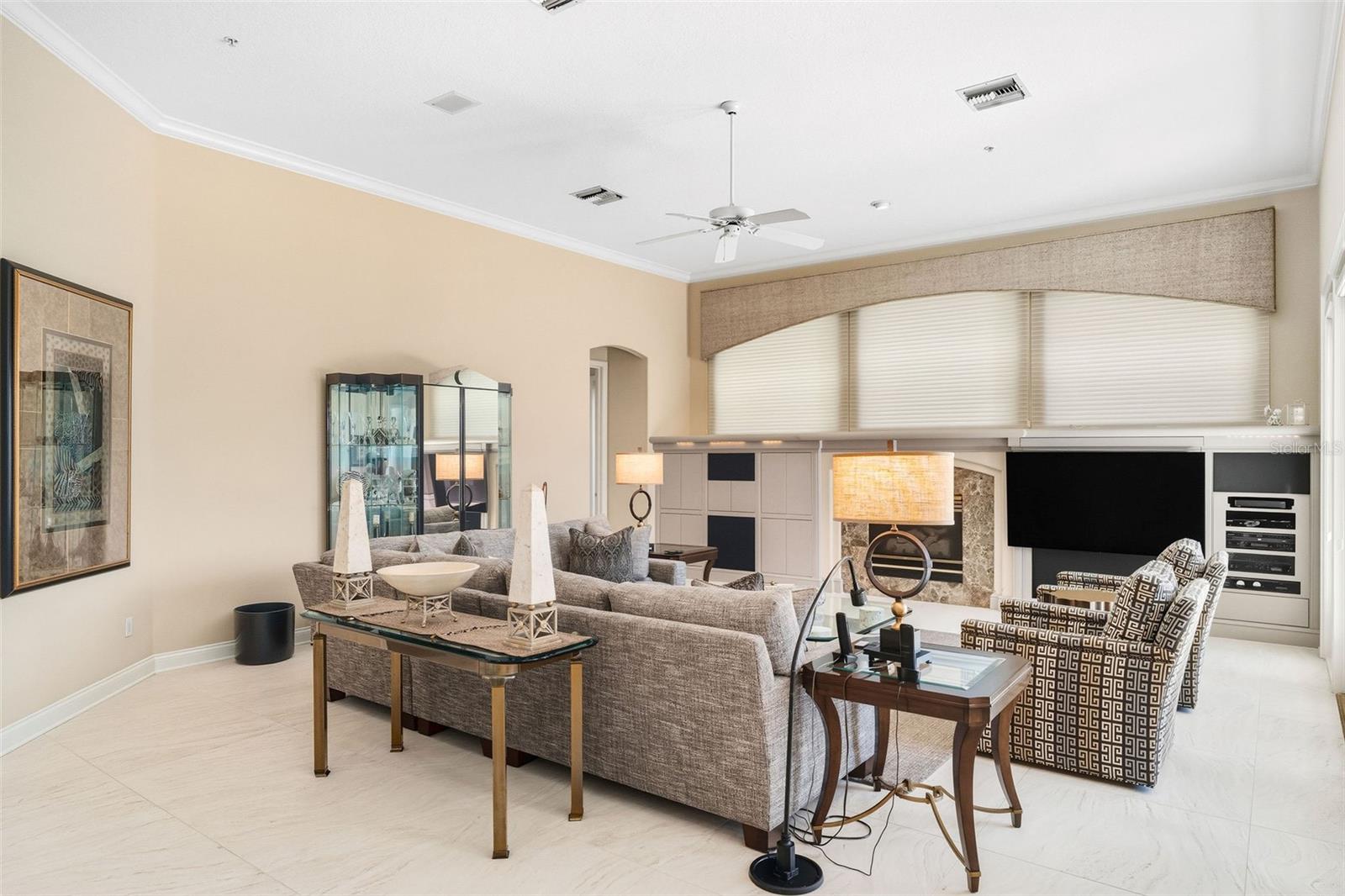 Built-in Features, Cathedral Ceiling(s), Ceiling Fans(s), Crown Molding, Open Floorplan, Solid Wood Cabinets, Split Bedroom, Stone Counters, Tray Ceiling(s), Walk-In Closet(s), Window Treatments