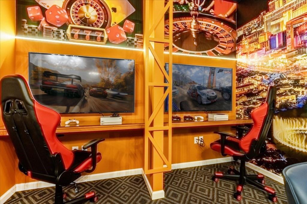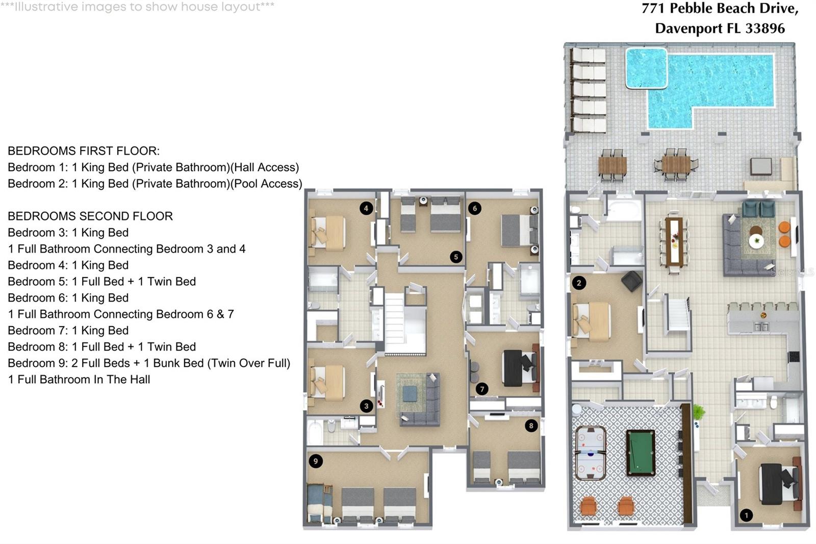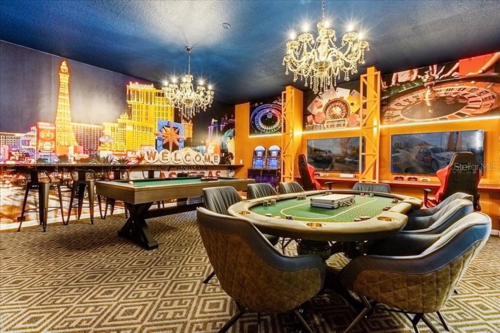 This is the vacation home you've been dreaming of. A rare opportunity to own this stunning 9-bedroom, 5-bath, fully furnished, turnkey short-term rental home, perfectly positioned on the 5th hole of a breathtaking golf course. Located in the highly sought-after, gated resort community of ChampionsGate. Just unpack and start enjoying your vacation—or begin earning immediate income from this incredible investment property. Step through the front door, switch off your electronics, and settle into your home away from home. After an exciting day at the theme parks, unwind in your private heated pool and spa while soaking in panoramic golf course views—with no rear neighbors, offering exceptional privacy. Sip your favorite beverage while preparing dinner on the outdoor BBQ, or cook up a storm in your gourmet kitchen, featuring quartz countertops, 42” cabinets with crown molding, and stainless steel appliances. The open-concept layout is perfect for entertaining—whether you’re cooking, watching TV, playing board games, or simply relaxing with loved ones. There’s seating for 5 at the breakfast bar and a large dining table that comfortably seats 10 guests. Got a second wind after dinner? Head to the game room. Prefer to kick back? Enjoy movie night in your private theater room. When it’s time to rest, retreat to one of your nine beautifully appointed bedrooms. The primary suite and an additional guest suite are conveniently located on the first floor for easy access—one of which includes private access to the pool. Upstairs, you’ll find two sets of Jack-and-Jill bedrooms, plus two additional guest rooms and another full bath—offering a total of 7 bedrooms and 3 bathrooms on the second level. Both first-floor suites offer full en-suites for maximum comfort and privacy. Champions Gate offers resort-style amenities like no other. The Oasis Club, a spectacular 16, 000 sq ft clubhouse, features a full-service restaurant and bar, movie theater, arcade/game room, business center, yoga room, Camp Oasis kids club, and a fully equipped fitness center. Outdoors, enjoy two large community pools, a water park, lazy river, tiki bar, sand volleyball courts, basketball, tennis courts, dog park, and air-conditioned cabanas. Golf enthusiasts will love the 18-hole championship golf courses, and there’s even a second clubhouse and water park for added fun. ChampionsGate is a secure, gated community with 24-hour surveillance—all included in your HOA fees, which also cover basic cable TV, high-speed internet, lawn care, and trash pickup. Be sure to view all photos, 3D tour, and Matterport walkthrough to fully experience the beauty and value this home offers. And best of all—you’re just minutes from world-class attractions, shopping, dining, the Orlando International Airport, and just over an hour from Florida’s stunning beaches.
